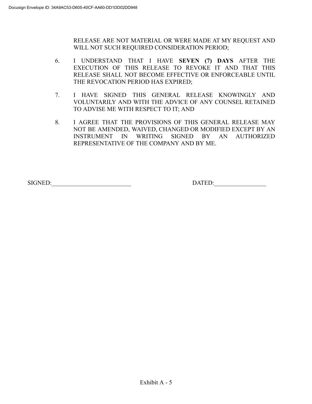 RELEASE ARE NOT MATERIAL OR WERE MADE AT MY REQUEST AND WILL NOT SUCH REQUIRED CONSIDERATION PERIOD; 6. I UNDERSTAND THAT I HAVE SEVEN (7) DAYS AFTER THE EXECUTION OF THIS RELEASE TO REVOKE IT AND THAT THIS RELEASE SHALL NOT BECOME EFFECTIVE OR ENFORCEABLE UNTIL THE REVOCATION PERIOD HAS EXPIRED; 7. I HAVE SIGNED THIS GENERAL RELEASE KNOWINGLY AND VOLUNTARILY AND WITH THE ADVICE OF ANY COUNSEL RETAINED TO ADVISE ME WITH RESPECT TO IT; AND 8. I AGREE THAT THE PROVISIONS OF THIS GENERAL RELEASE MAY NOT BE AMENDED, WAIVED, CHANGED OR MODIFIED EXCEPT BY AN INSTRUMENT IN WRITING SIGNED BY AN AUTHORIZED REPRESENTATIVE OF THE COMPANY AND BY ME. SIGNED:__________________________ DATED:_________________ Exhibit A - 5 Docusign Envelope ID: 34A9AC53-D605-40CF-AA60-DD1DD02DD948