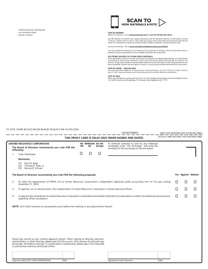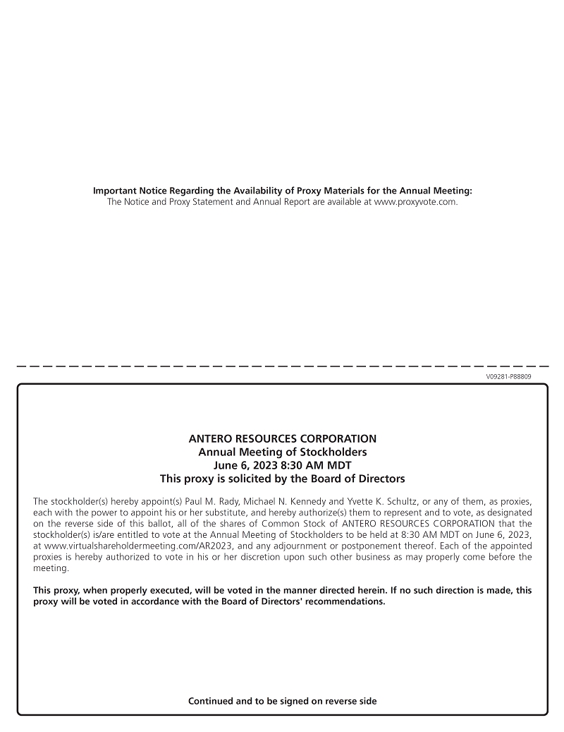 | The 2023 Annual Meeting of Stockholders of Antero Resources Corporation (“Antero”) will be held online on Tuesday, June 6, 2023, at 8:30 A.M. Mountain Time. The Annual Meeting is being held for the purposes listed below: | |
