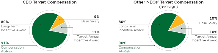 | • | Long-term incentive compensation awards are 50% performance-based equity awards for our Named Executive Officers based on absolute TSR performance hurdles and leverage metrics. All long-term incentive awards vest over several years to reward sustained Company performance over time. |