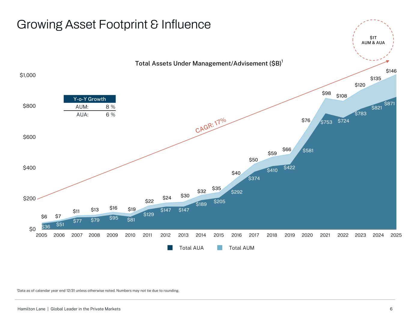 5Hamilton Lane | Global Leader in the Private Markets Business Performance Financial Results Dividend • Assets under management and fee-earning assets under management were $146 billion and $79 billion, respectively, as of December 31, 2025, increases of 8% and 11%, respectively, compared to December 31, 2024 • Fee Related Earnings1 increased 37% compared to the nine months ended December 31, 2024 USD in millions except per share amounts Q3 FY26 QTD Q3 FY26 YTD vs Q3 FY25 YTD Management and advisory fees $153.2 $429.0 11 % Net income attributable to Hamilton Lane Incorporated $58.4 $183.0 10 % GAAP EPS $1.37 $4.35 5 % Adjusted net income1 $84.5 $240.1 16 % Non-GAAP EPS1 $1.55 $4.41 15 % Fee Related Earnings1 $93.8 $254.6 37 % Adjusted EBITDA1 $107.5 $304.1 15 % • Declared a quarterly dividend of $0.54 per share of Class A common stock to record holders at the close of business on March 20, 2026 1Adjusted net income, non-GAAP earnings per share, Fee Related Earnings and Adjusted EBITDA are non-GAAP financial measures. For the reconciliations of our non-GAAP financial measures to the most directly comparable GAAP financial measures and for the reasons we believe the non-GAAP measures provide useful information, see pages 20 through 22 of this presentation. Period Highlights