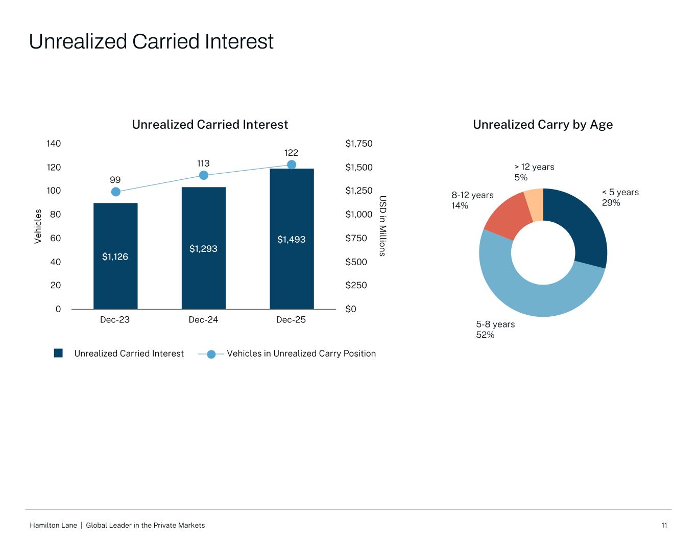 11Hamilton Lane | Global Leader in the Private Markets Period Ending V eh ic le s U S D in M illions Unrealized Carried Interest $1,126 $1,293 $1,493 99 113 122 Unrealized Carried Interest Vehicles in Unrealized Carry Position Dec-23 Dec-24 Dec-25 0 20 40 60 80 100 120 140 $0 $250 $500 $750 $1,000 $1,250 $1,500 $1,750 Unrealized Carry by Age < 5 years 29% 5-8 years 52% 8-12 years 14% > 12 years 5% Unrealized Carried Interest