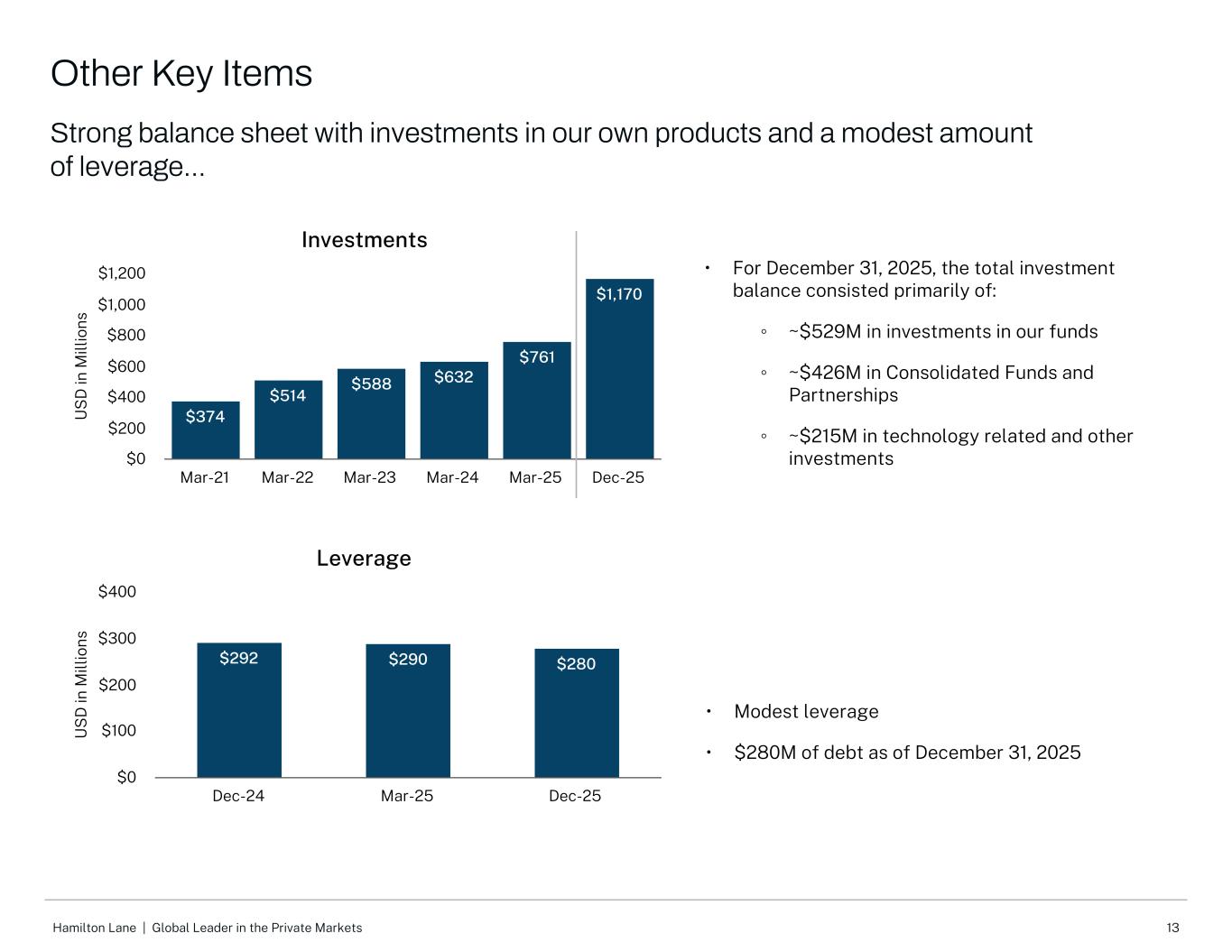 12Hamilton Lane | Global Leader in the Private Markets Net Income Attributable to HLI Adjusted EBITDA1 Fee Related Earnings1 U S D in M ill io ns $264 $304 Q3 FY25 Q3 FY26 U S D in M ill io ns $167 $183 Q3 FY25 Q3 FY26 U S D in M ill io ns $186 $255 Q3 FY25 Q3 FY26 Y-o-Y Change: 10% 1Adjusted EBITDA and Fee Related Earnings are non-GAAP financial measures. For the reconciliations of our non-GAAP financial measures to the most directly comparable GAAP financial measures and for the reasons we believe the non-GAAP measures provide useful information, see pages 20 and 21 of this presentation. Y-o-Y Change: 15% Y-o-Y Change: 37% Consolidated Earnings Stable long-term growth YTD YTD YTD • $58M in net income attributable to HLI for the quarter • Y-o-Y increase of 15% driven by increase in revenue • Y-o-Y growth of 37% • Long-term double digit growth in Fee Related Earnings U S D in M ill io ns $61 $217 FY20 FY25 U S D in M ill io ns $127 $366 FY20 FY25 U S D in M ill io ns $109 $276 FY20 FY25 CAGR: 20% CAGR: 24% Long-Term Growth Long-Term Growth Long-Term Growth CAGR: 29%