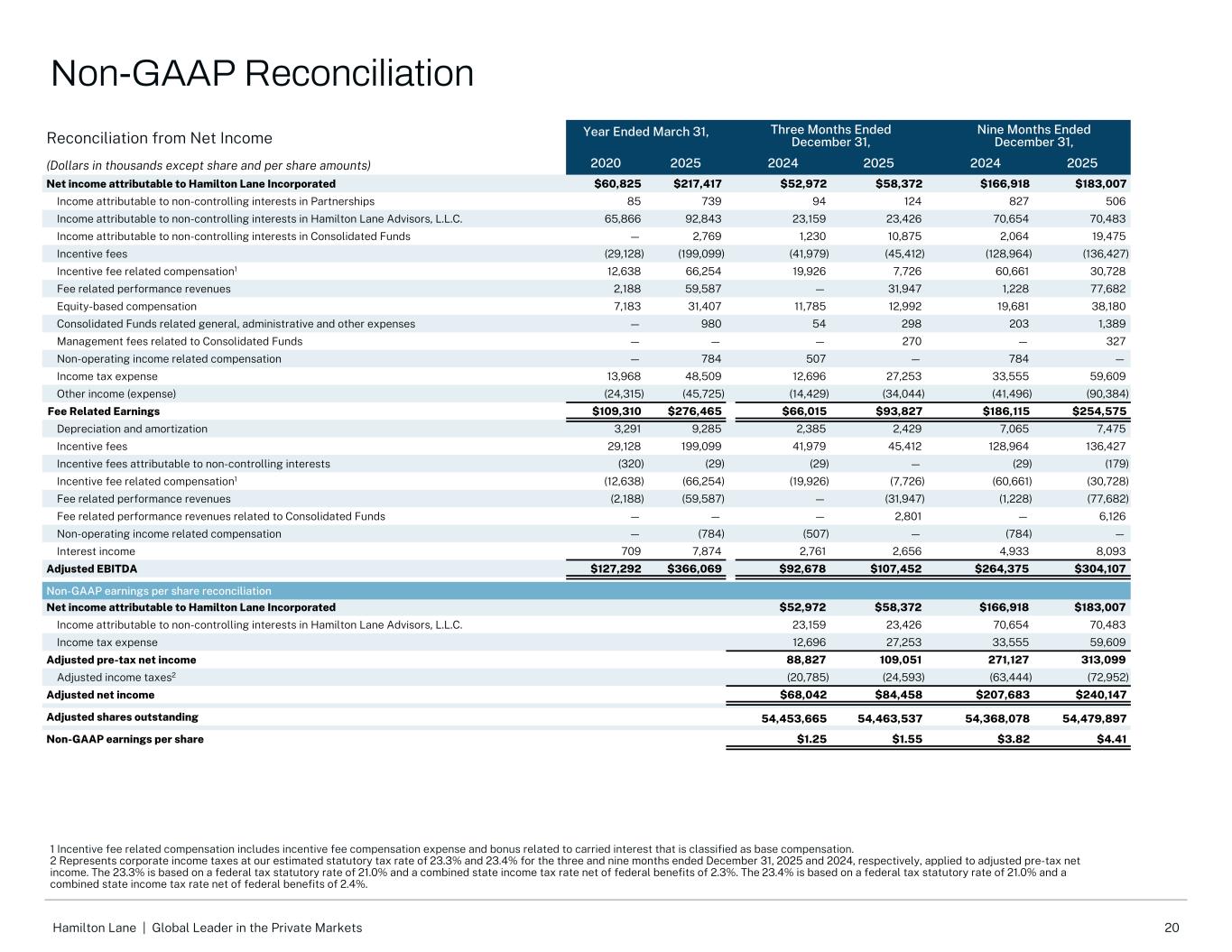20Hamilton Lane | Global Leader in the Private Markets Reconciliation from Net Income Year Ended March 31, Three Months Ended December 31, Nine Months Ended December 31, (Dollars in thousands except share and per share amounts) 2020 2025 2024 2025 2024 2025 Net income attributable to Hamilton Lane Incorporated $60,825 $217,417 $52,972 $58,372 $166,918 $183,007 Income attributable to non-controlling interests in Partnerships 85 739 94 124 827 506 Income attributable to non-controlling interests in Hamilton Lane Advisors, L.L.C. 65,866 92,843 23,159 23,426 70,654 70,483 Income attributable to non-controlling interests in Consolidated Funds — 2,769 1,230 10,875 2,064 19,475 Incentive fees (29,128) (199,099) (41,979) (45,412) (128,964) (136,427) Incentive fee related compensation1 12,638 66,254 19,926 7,726 60,661 30,728 Fee related performance revenues 2,188 59,587 — 31,947 1,228 77,682 Equity-based compensation 7,183 31,407 11,785 12,992 19,681 38,180 Consolidated Funds related general, administrative and other expenses — 980 54 298 203 1,389 Management fees related to Consolidated Funds — — — 270 — 327 Non-operating income related compensation — 784 507 — 784 — Income tax expense 13,968 48,509 12,696 27,253 33,555 59,609 Other income (expense) (24,315) (45,725) (14,429) (34,044) (41,496) (90,384) Fee Related Earnings $109,310 $276,465 $66,015 $93,827 $186,115 $254,575 Depreciation and amortization 3,291 9,285 2,385 2,429 7,065 7,475 Incentive fees 29,128 199,099 41,979 45,412 128,964 136,427 Incentive fees attributable to non-controlling interests (320) (29) (29) — (29) (179) Incentive fee related compensation1 (12,638) (66,254) (19,926) (7,726) (60,661) (30,728) Fee related performance revenues (2,188) (59,587) — (31,947) (1,228) (77,682) Fee related performance revenues related to Consolidated Funds — — — 2,801 — 6,126 Non-operating income related compensation — (784) (507) — (784) — Interest income 709 7,874 2,761 2,656 4,933 8,093 Adjusted EBITDA $127,292 $366,069 $92,678 $107,452 $264,375 $304,107 Non-GAAP earnings per share reconciliation Net income attributable to Hamilton Lane Incorporated $52,972 $58,372 $166,918 $183,007 Income attributable to non-controlling interests in Hamilton Lane Advisors, L.L.C. 23,159 23,426 70,654 70,483 Income tax expense 12,696 27,253 33,555 59,609 Adjusted pre-tax net income 88,827 109,051 271,127 313,099 Adjusted income taxes2 (20,785) (24,593) (63,444) (72,952) Adjusted net income $68,042 $84,458 $207,683 $240,147 Adjusted shares outstanding 54,453,665 54,463,537 54,368,078 54,479,897 Non-GAAP earnings per share $1.25 $1.55 $3.82 $4.41 1 Incentive fee related compensation includes incentive fee compensation expense and bonus related to carried interest that is classified as base compensation. 2 Represents corporate income taxes at our estimated statutory tax rate of 23.3% and 23.4% for the three and nine months ended December 31, 2025 and 2024, respectively, applied to adjusted pre-tax net income. The 23.3% is based on a federal tax statutory rate of 21.0% and a combined state income tax rate net of federal benefits of 2.3%. The 23.4% is based on a federal tax statutory rate of 21.0% and a combined state income tax rate net of federal benefits of 2.4%. Non-GAAP Reconciliation