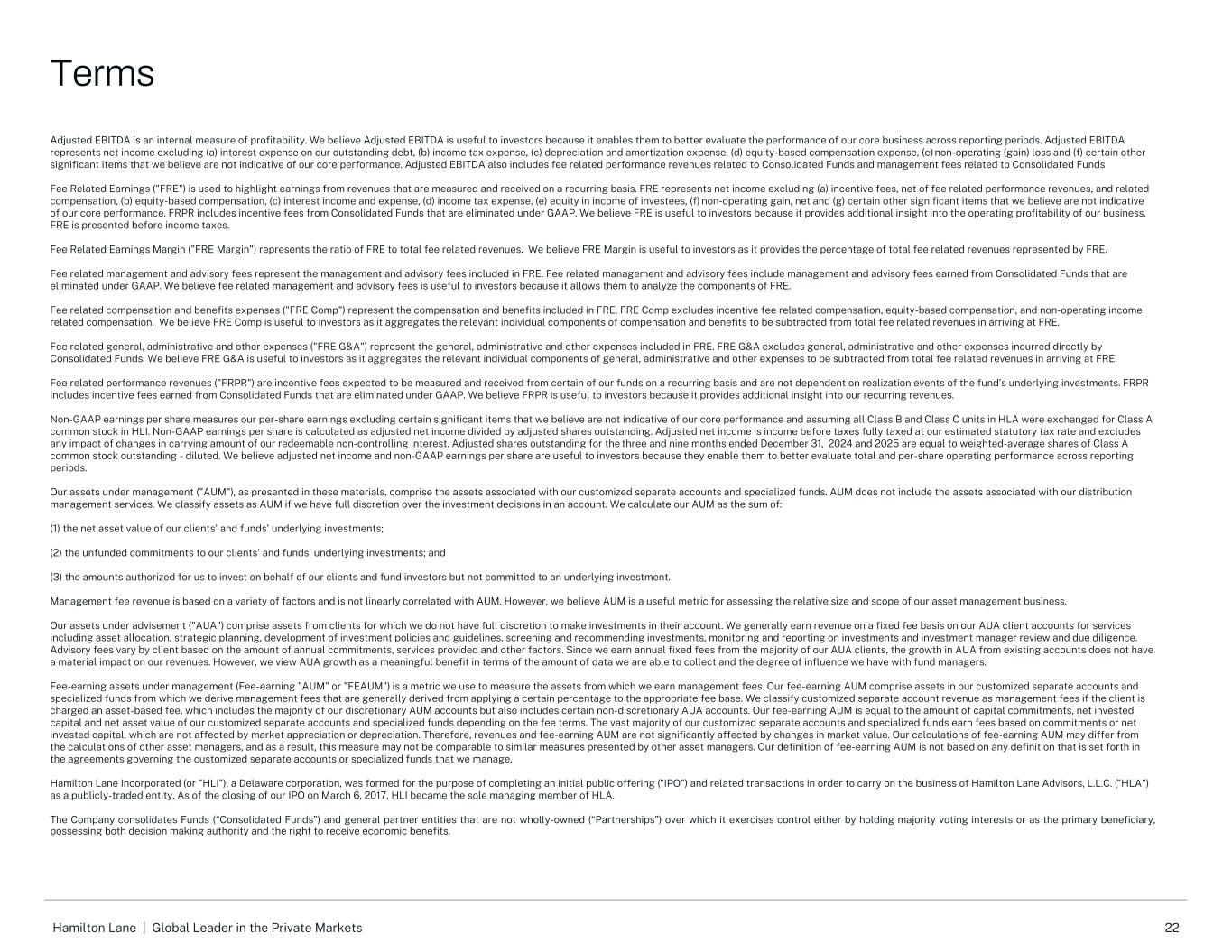 22Hamilton Lane | Global Leader in the Private Markets Adjusted EBITDA is an internal measure of profitability. We believe Adjusted EBITDA is useful to investors because it enables them to better evaluate the performance of our core business across reporting periods. Adjusted EBITDA represents net income excluding (a) interest expense on our outstanding debt, (b) income tax expense, (c) depreciation and amortization expense, (d) equity-based compensation expense, (e) non-operating (gain) loss and (f) certain other significant items that we believe are not indicative of our core performance. Adjusted EBITDA also includes fee related performance revenues related to Consolidated Funds and management fees related to Consolidated Funds Fee Related Earnings ("FRE") is used to highlight earnings from revenues that are measured and received on a recurring basis. FRE represents net income excluding (a) incentive fees, net of fee related performance revenues, and related compensation, (b) equity-based compensation, (c) interest income and expense, (d) income tax expense, (e) equity in income of investees, (f) non-operating gain, net and (g) certain other significant items that we believe are not indicative of our core performance. FRPR includes incentive fees from Consolidated Funds that are eliminated under GAAP. We believe FRE is useful to investors because it provides additional insight into the operating profitability of our business. FRE is presented before income taxes. Fee Related Earnings Margin ("FRE Margin") represents the ratio of FRE to total fee related revenues. We believe FRE Margin is useful to investors as it provides the percentage of total fee related revenues represented by FRE. Fee related management and advisory fees represent the management and advisory fees included in FRE. Fee related management and advisory fees include management and advisory fees earned from Consolidated Funds that are eliminated under GAAP. We believe fee related management and advisory fees is useful to investors because it allows them to analyze the components of FRE. Fee related compensation and benefits expenses ("FRE Comp") represent the compensation and benefits included in FRE. FRE Comp excludes incentive fee related compensation, equity-based compensation, and non-operating income related compensation. We believe FRE Comp is useful to investors as it aggregates the relevant individual components of compensation and benefits to be subtracted from total fee related revenues in arriving at FRE. Fee related general, administrative and other expenses ("FRE G&A") represent the general, administrative and other expenses included in FRE. FRE G&A excludes general, administrative and other expenses incurred directly by Consolidated Funds. We believe FRE G&A is useful to investors as it aggregates the relevant individual components of general, administrative and other expenses to be subtracted from total fee related revenues in arriving at FRE. Fee related performance revenues ("FRPR") are incentive fees expected to be measured and received from certain of our funds on a recurring basis and are not dependent on realization events of the fund’s underlying investments. FRPR includes incentive fees earned from Consolidated Funds that are eliminated under GAAP. We believe FRPR is useful to investors because it provides additional insight into our recurring revenues. Non-GAAP earnings per share measures our per-share earnings excluding certain significant items that we believe are not indicative of our core performance and assuming all Class B and Class C units in HLA were exchanged for Class A common stock in HLI. Non-GAAP earnings per share is calculated as adjusted net income divided by adjusted shares outstanding. Adjusted net income is income before taxes fully taxed at our estimated statutory tax rate and excludes any impact of changes in carrying amount of our redeemable non-controlling interest. Adjusted shares outstanding for the three and nine months ended December 31, 2024 and 2025 are equal to weighted-average shares of Class A common stock outstanding - diluted. We believe adjusted net income and non-GAAP earnings per share are useful to investors because they enable them to better evaluate total and per-share operating performance across reporting periods. Our assets under management ("AUM"), as presented in these materials, comprise the assets associated with our customized separate accounts and specialized funds. AUM does not include the assets associated with our distribution management services. We classify assets as AUM if we have full discretion over the investment decisions in an account. We calculate our AUM as the sum of: (1) the net asset value of our clients' and funds' underlying investments; (2) the unfunded commitments to our clients' and funds' underlying investments; and (3) the amounts authorized for us to invest on behalf of our clients and fund investors but not committed to an underlying investment. Management fee revenue is based on a variety of factors and is not linearly correlated with AUM. However, we believe AUM is a useful metric for assessing the relative size and scope of our asset management business. Our assets under advisement ("AUA") comprise assets from clients for which we do not have full discretion to make investments in their account. We generally earn revenue on a fixed fee basis on our AUA client accounts for services including asset allocation, strategic planning, development of investment policies and guidelines, screening and recommending investments, monitoring and reporting on investments and investment manager review and due diligence. Advisory fees vary by client based on the amount of annual commitments, services provided and other factors. Since we earn annual fixed fees from the majority of our AUA clients, the growth in AUA from existing accounts does not have a material impact on our revenues. However, we view AUA growth as a meaningful benefi