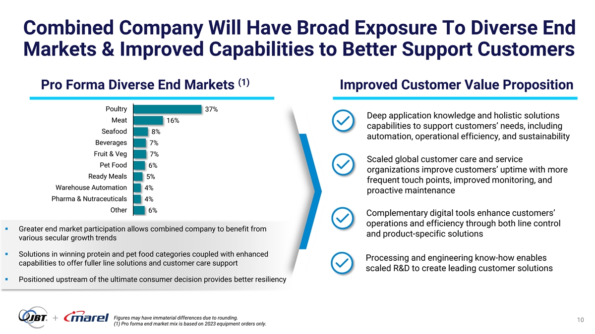 Important Additional Information Important Notices This presentation is not intended to and does not constitute an offer to sell or the solicitation of an offer to buy any securities, nor shall there be any sale of securities in any jurisdiction in which such offer, solicitation or sale would be unlawful prior to registration or qualification under the securities laws of any such jurisdiction. In particular, this presentation is not an offer of securities for sale in the United States, Iceland, the Netherlands or Denmark. Note to U.S. Shareholders It is important that U.S. shareholders understand that the Offer and any related offer documents are subject to disclosure and takeover laws and regulations in Iceland and other European jurisdictions, which may be different from those of the United States. The Offer will be made in compliance with the U.S. tender offer rules, including Regulation 14E under the Securities Exchange Act of 1934, as amended (the “Exchange Act”), and any exemption available to JBT in respect of securities of foreign private issuers provided by Rule 14d-1(d) under the Exchange Act. Important Additional Information No offer of JBT securities shall be made except by means of a prospectus meeting the requirements of Section 10 of the Securities Act of 1933, as amended, or an exemption from registration, and applicable European regulations, including the Icelandic Prospectus Act no. 14/2020 and the Icelandic Takeover Act no. 108/2007 on takeovers. In connection with the Offer, JBT filed with the SEC a registration statement on Form S-4 (File No. 333-279438) (the “Registration Statement”) that included a proxy statement/prospectus (the “Proxy Statement/Prospectus”). The Registration Statement was declared effective by the SEC on June 25, 2024. Additionally, JBT filed with the Financial Supervisory Authority of the Central Bank of Iceland (the “FSA”) an offer document and a prospectus, which have been approved by the FSA and which have been published. SHAREHOLDERS ARE URGED TO READ THE PROXY STATEMENT/PROSPECTUS, THE PROSPECTUS, AND THE OFFER DOCUMENT, AS APPLICABLE, AS WELL AS ANY AMENDMENTS OR SUPPLEMENTS TO THOSE DOCUMENTS AND ANY OTHER RELEVANT DOCUMENTS FILED WITH THE SEC OR THE FSA CAREFULLY AND IN THEIR ENTIRETY BECAUSE THEY CONTAIN OR WILL CONTAIN IMPORTANT INFORMATION. Shareholders may obtain a free copy of the Proxy Statement/Prospectus, as well as other filings containing information about JBT, without charge, at the SEC’s website at www.sec.gov, and on JBT’s website at https://ir.jbtc.com/overview/default.aspx. You may obtain a free copy of the prospectus on the FSA’s website at www.fme.is and on JBT’s website at https://www.jbtc.com/jbt-marel-offer- launch/ as well as a free copy of the offer document. 3
