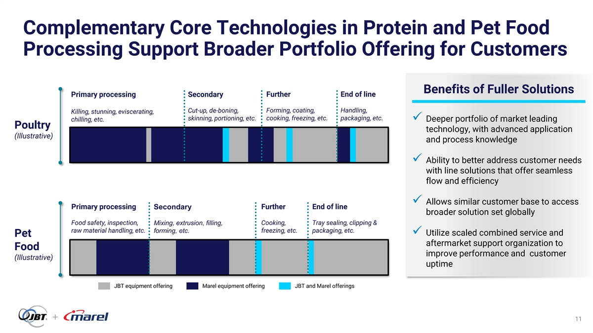 Combined Company Will Have Broad Exposure To Diverse End Markets & Improved Capabilities to Better Support Customers (1) Pro Forma Diverse End Markets Improved Customer Value Proposition Poultry 37% Deep application knowledge and holistic solutions Meat 16% capabilities to support customers’ needs, including Seafood 8% automation, operational efficiency, and sustainability Beverages 7% Fruit & Veg 7% Scaled global customer care and service Pet Food 6% organizations improve customers’ uptime with more Ready Meals 5% frequent touch points, improved monitoring, and Warehouse Automation 4% proactive maintenance Pharma & Nutraceuticals 4% Other 6% Complementary digital tools enhance customers’ operations and efficiency through both line control ▪ Greater end market participation allows combined company to benefit from and product-specific solutions various secular growth trends ▪ Solutions in winning protein and pet food categories coupled with enhanced Processing and engineering know-how enables capabilities to offer fuller line solutions and customer care support scaled R&D to create leading customer solutions ▪ Positioned upstream of the ultimate consumer decision provides better resiliency Figures may have immaterial differences due to rounding. 10 (1) Pro forma end market mix is based on 2023 equipment orders only.