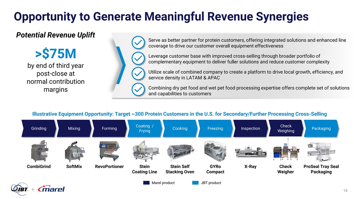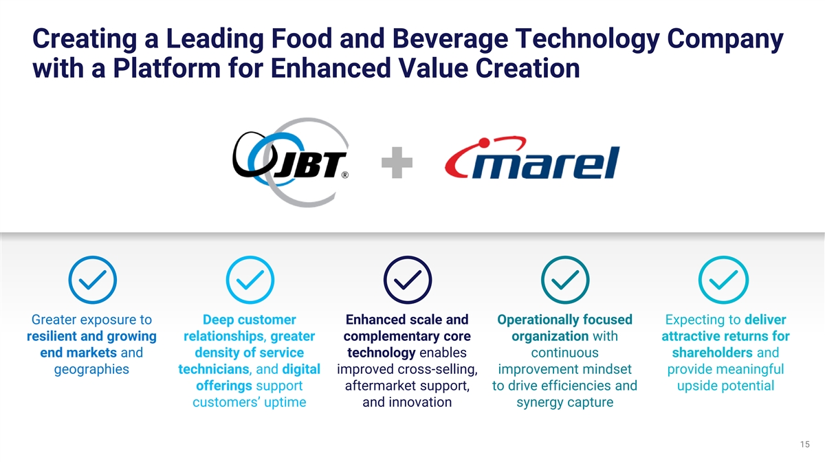 Opportunity to Generate Meaningful Revenue Synergies Potential Revenue Uplift Serve as better partner for protein customers, offering integrated solutions and enhanced line coverage to drive our customer overall equipment effectiveness Leverage customer base with improved cross-selling through broader portfolio of >$75M complementary equipment to deliver fuller solutions and reduce customer complexity by end of third year Utilize scale of combined company to create a platform to drive local growth, efficiency, and post-close at service density in LATAM & APAC normal contribution Combining dry pet food and wet pet food processing expertise offers complete set of solutions margins and capabilities to customers Illustrative Equipment Opportunity: Target ~300 Protein Customers in the U.S. for Secondary/Further Processing Cross-Selling Coating / Check Grinding Mixing Forming Cooking Freezing Inspection Packaging Frying Weighing CombiGrind SoftMix RevoPortioner S Stei tein n Stein Self GYRo X-Ray C Check heck ProSeal Tray Seal Co Coa ati ting ng Li Line ne Stacking Oven Compact W Wei eigher gher Packaging Marel product JBT product 14