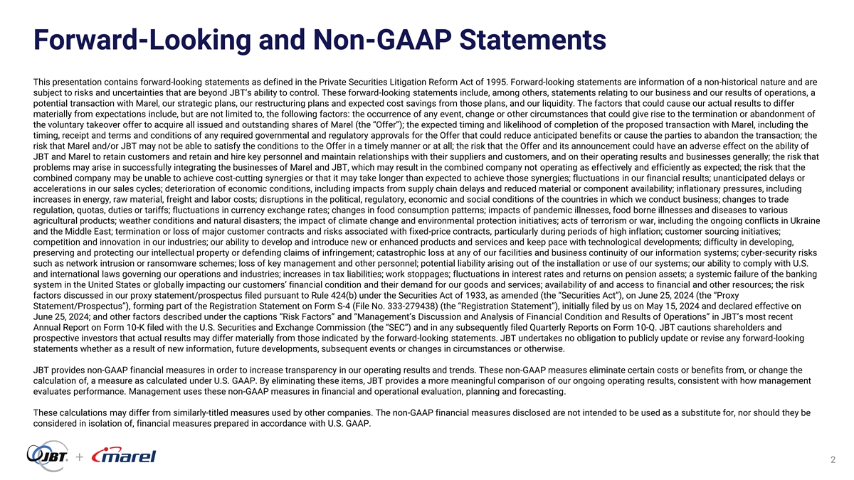 Forward-Looking and Non-GAAP Statements This presentation contains forward-looking statements as defined in the Private Securities Litigation Reform Act of 1995. Forward-looking statements are information of a non-historical nature and are subject to risks and uncertainties that are beyond JBT’s ability to control. These forward-looking statements include, among others, statements relating to our business and our results of operations, a potential transaction with Marel, our strategic plans, our restructuring plans and expected cost savings from those plans, and our liquidity. The factors that could cause our actual results to differ materially from expectations include, but are not limited to, the following factors: the occurrence of any event, change or other circumstances that could give rise to the termination or abandonment of the voluntary takeover offer to acquire all issued and outstanding shares of Marel (the “Offer”); the expected timing and likelihood of completion of the proposed transaction with Marel, including the timing, receipt and terms and conditions of any required governmental and regulatory approvals for the Offer that could reduce anticipated benefits or cause the parties to abandon the transaction; the risk that Marel and/or JBT may not be able to satisfy the conditions to the Offer in a timely manner or at all; the risk that the Offer and its announcement could have an adverse effect on the ability of JBT and Marel to retain customers and retain and hire key personnel and maintain relationships with their suppliers and customers, and on their operating results and businesses generally; the risk that problems may arise in successfully integrating the businesses of Marel and JBT, which may result in the combined company not operating as effectively and efficiently as expected; the risk that the combined company may be unable to achieve cost-cutting synergies or that it may take longer than expected to achieve those synergies; fluctuations in our financial results; unanticipated delays or accelerations in our sales cycles; deterioration of economic conditions, including impacts from supply chain delays and reduced material or component availability; inflationary pressures, including increases in energy, raw material, freight and labor costs; disruptions in the political, regulatory, economic and social conditions of the countries in which we conduct business; changes to trade regulation, quotas, duties or tariffs; fluctuations in currency exchange rates; changes in food consumption patterns; impacts of pandemic illnesses, food borne illnesses and diseases to various agricultural products; weather conditions and natural disasters; the impact of climate change and environmental protection initiatives; acts of terrorism or war, including the ongoing conflicts in Ukraine and the Middle East; termination or loss of major customer contracts and risks associated with fixed-price contracts, particularly during periods of high inflation; customer sourcing initiatives; competition and innovation in our industries; our ability to develop and introduce new or enhanced products and services and keep pace with technological developments; difficulty in developing, preserving and protecting our intellectual property or defending claims of infringement; catastrophic loss at any of our facilities and business continuity of our information systems; cyber-security risks such as network intrusion or ransomware schemes; loss of key management and other personnel; potential liability arising out of the installation or use of our systems; our ability to comply with U.S. and international laws governing our operations and industries; increases in tax liabilities; work stoppages; fluctuations in interest rates and returns on pension assets; a systemic failure of the banking system in the United States or globally impacting our customers’ financial condition and their demand for our goods and services; availability of and access to financial and other resources; the risk factors discussed in our proxy statement/prospectus filed pursuant to Rule 424(b) under the Securities Act of 1933, as amended (the “Securities Act”), on June 25, 2024 (the “Proxy Statement/Prospectus”), forming part of the Registration Statement on Form S-4 (File No. 333-279438) (the “Registration Statement”), initially filed by us on May 15, 2024 and declared effective on June 25, 2024; and other factors described under the captions “Risk Factors” and “Management’s Discussion and Analysis of Financial Condition and Results of Operations” in JBT’s most recent Annual Report on Form 10-K filed with the U.S. Securities and Exchange Commission (the “SEC”) and in any subsequently filed Quarterly Reports on Form 10-Q. JBT cautions shareholders and prospective investors that actual results may differ materially from those indicated by the forward-looking statements. JBT undertakes no obligation to publicly update or revise any forward-looking statements whether as a result of new information, future developments, subsequent events or changes in circumstances or otherwise. JBT provides non-GAAP financial measures in order to increase transparency in our operating results and trends. These non-GAAP measures eliminate certain costs or benefits from, or change the calculation of, a measure as calculated under U.S. GAAP. By eliminating these items, JBT provides a more meaningful comparison of our ongoing operating results, consistent with how management evaluates performance. Management uses these non-GAAP measures in financial and operational evaluation, planning and forecasting. These calculations may differ from similarly-titled measures used by other companies. The non-GAAP financial measures disclosed are not intended to be used as a substitute for, nor should they be considered in isolation of, financial measures prepared in accordance with U.S. GAAP. 2