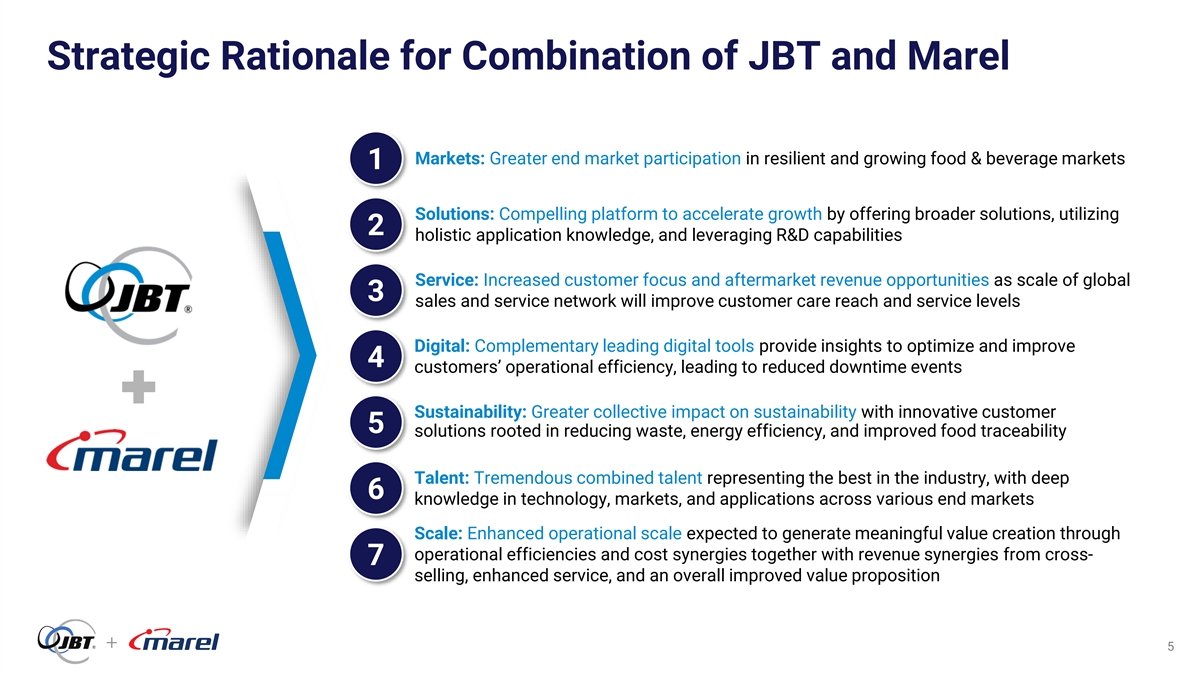 Presenters Brian Deck Arni Sigurdsson Matt Meister President and Chief Executive Officer, Chief Executive Officer, EVP and Chief Financial Officer, JBT Marel JBT 4