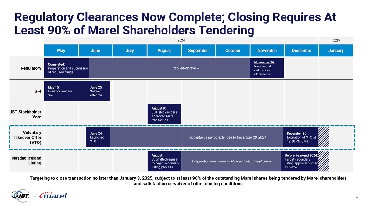 Strategic Rationale for Combination of JBT and Marel Markets: Greater end market participation in resilient and growing food & beverage markets 1 Solutions: Compelling platform to accelerate growth by offering broader solutions, utilizing 2 holistic application knowledge, and leveraging R&D capabilities Service: Increased customer focus and aftermarket revenue opportunities as scale of global 3 sales and service network will improve customer care reach and service levels Digital: Complementary leading digital tools provide insights to optimize and improve 4 customers’ operational efficiency, leading to reduced downtime events Sustainability: Greater collective impact on sustainability with innovative customer 5 solutions rooted in reducing waste, energy efficiency, and improved food traceability Talent: Tremendous combined talent representing the best in the industry, with deep 6 knowledge in technology, markets, and applications across various end markets Scale: Enhanced operational scale expected to generate meaningful value creation through operational efficiencies and cost synergies together with revenue synergies from cross- 7 selling, enhanced service, and an overall improved value proposition 5