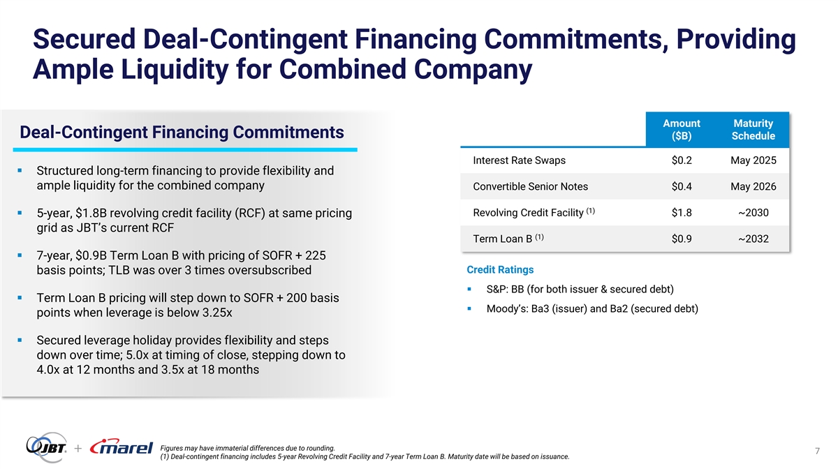 Regulatory Clearances Now Complete; Closing Requires At Least 90% of Marel Shareholders Tendering 2024 2025 May June July August September October November December January November 26: Completed: Received all Preparation and submission Regulatory review Regulatory outstanding of required filings clearances May 15: June 25: Filed preliminary S-4 went S-4 S-4 effective August 8: JBT Stockholder JBT stockholders approved Marel Vote transaction Voluntary June 24: December 20 Launched Acceptance period extended to December 20, 2024 Expiration of VTO at Takeover Offer VTO 12:00 PM GMT (VTO) August: Before Year-end 2024: Nasdaq Iceland Submitted request Target secondary Preparation and review of Nasdaq Iceland application to begin secondary listing approval prior to Listing listing process YE 2024 Targeting to close transaction no later than January 3, 2025, subject to at least 90% of the outstanding Marel shares being tendered by Marel shareholders and satisfaction or waiver of other closing conditions 6