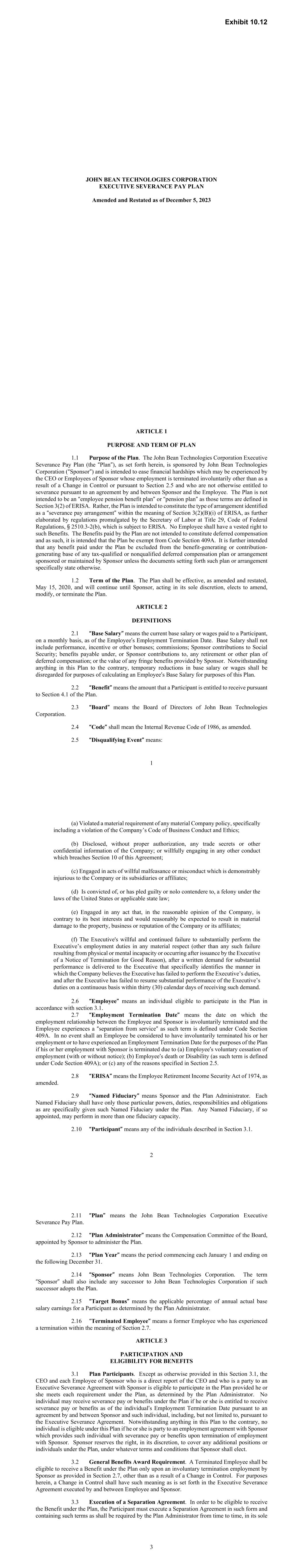 Exhibit 10.12 JOHN BEAN TECHNOLOGIES CORPORATION EXECUTIVE SEVERANCE PAY PLAN Amended and Restated as of December 5, 2023 1 ARTICLE 1 PURPOSE AND TERM OF PLAN 1.1 Purpose of the Plan. The John Bean Technologies Corporation Executive Severance Pay Plan (the “Plan”), as set forth herein, is sponsored by John Bean Technologies Corporation (“Sponsor”) and is intended to ease financial hardships which may be experienced by the CEO or Employees of Sponsor whose employment is terminated involuntarily other than as a result of a Change in Control or pursuant to Section 2.5 and who are not otherwise entitled to severance pursuant to an agreement by and between Sponsor and the Employee. The Plan is not intended to be an “employee pension benefit plan” or “pension plan” as those terms are defined in Section 3(2) of ERISA. Rather, the Plan is intended to constitute the type of arrangement identified as a “severance pay arrangement” within the meaning of Section 3(2)(B)(i) of ERISA, as further elaborated by regulations promulgated by the Secretary of Labor at Title 29, Code of Federal Regulations, § 2510.3-2(b), which is subject to ERISA. No Employee shall have a vested right to such Benefits. The Benefits paid by the Plan are not intended to constitute deferred compensation and as such, it is intended that the Plan be exempt from Code Section 409A. It is further intended that any benefit paid under the Plan be excluded from the benefit-generating or contribution- generating base of any tax-qualified or nonqualified deferred compensation plan or arrangement sponsored or maintained by Sponsor unless the documents setting forth such plan or arrangement specifically state otherwise. 1.2 Term of the Plan. The Plan shall be effective, as amended and restated, May 15, 2020, and will continue until Sponsor, acting in its sole discretion, elects to amend, modify, or terminate the Plan. ARTICLE 2 DEFINITIONS 2.1 “Base Salary” means the current base salary or wages paid to a Participant, on a monthly basis, as of the Employee’s Employment Termination Date. Base Salary shall not include performance, incentive or other bonuses; commissions; Sponsor contributions to Social Security; benefits payable under, or Sponsor contributions to, any retirement or other plan of deferred compensation; or the value of any fringe benefits provided by Sponsor. Notwithstanding anything in this Plan to the contrary, temporary reductions in base salary or wages shall be disregarded for purposes of calculating an Employee’s Base Salary for purposes of this Plan. 2.2 “Benefit” means the amount that a Participant is entitled to receive pursuant to Section 4.1 of the Plan. 2.3 “Board” means the Board of Directors of John Bean Technologies Corporation. 2.4 “Code” shall mean the Internal Revenue Code of 1986, as amended. 2.5 “Disqualifying Event” means: 2 (a) Violated a material requirement of any material Company policy, specifically including a violation of the Company’s Code of Business Conduct and Ethics; (b) Disclosed, without proper authorization, any trade secrets or other confidential information of the Company; or willfully engaging in any other conduct which breaches Section 10 of this Agreement; (c) Engaged in acts of willful malfeasance or misconduct which is demonstrably injurious to the Company or its subsidiaries or affiliates; (d) Is convicted of, or has pled guilty or nolo contendere to, a felony under the laws of the United States or applicable state law; (e) Engaged in any act that, in the reasonable opinion of the Company, is contrary to its best interests and would reasonably be expected to result in material damage to the property, business or reputation of the Company or its affiliates; (f) The Executive's willful and continued failure to substantially perform the Executive’s employment duties in any material respect (other than any such failure resulting from physical or mental incapacity or occurring after issuance by the Executive of a Notice of Termination for Good Reason), after a written demand for substantial performance is delivered to the Executive that specifically identifies the manner in which the Company believes the Executive has failed to perform the Executive’s duties, and after the Executive has failed to resume substantial performance of the Executive’s duties on a continuous basis within thirty (30) calendar days of receiving such demand. 2.6 “Employee” means an individual eligible to participate in the Plan in accordance with section 3.1. 2.7 “Employment Termination Date” means the date on which the employment relationship between the Employee and Sponsor is involuntarily terminated and the Employee experiences a “separation from service” as such term is defined under Code Section 409A. In no event shall an Employee be considered to have involuntarily terminated his or her employment or to have experienced an Employment Termination Date for the purposes of the Plan if his or her employment with Sponsor is terminated due to (a) Employee’s voluntary cessation of employment (with or without notice); (b) Employee’s death or Disability (as such term is defined under Code Section 409A); or (c) any of the reasons specified in Section 2.5. 2.8 “ERISA” means the Employee Retirement Income Security Act of 1974, as amended. 2.9 “Named Fiduciary” means Sponsor and the Plan Administrator. Each Named Fiduciary shall have only those particular powers, duties, responsibilities and obligations as are specifically given such Named Fiduciary under the Plan. Any Named Fiduciary, if so appointed, may perform in more than one fiduciary capacity. 2.10 “Participant” means any of the individuals described in Section 3.1. 3 2.11 “Plan” means the John Bean Technologies Corporation Executive Severance Pay Plan. 2.12 “Plan Administrator” means the Compensation Committee of the Board, appointed by Sponsor to administer the Plan. 2.13 “