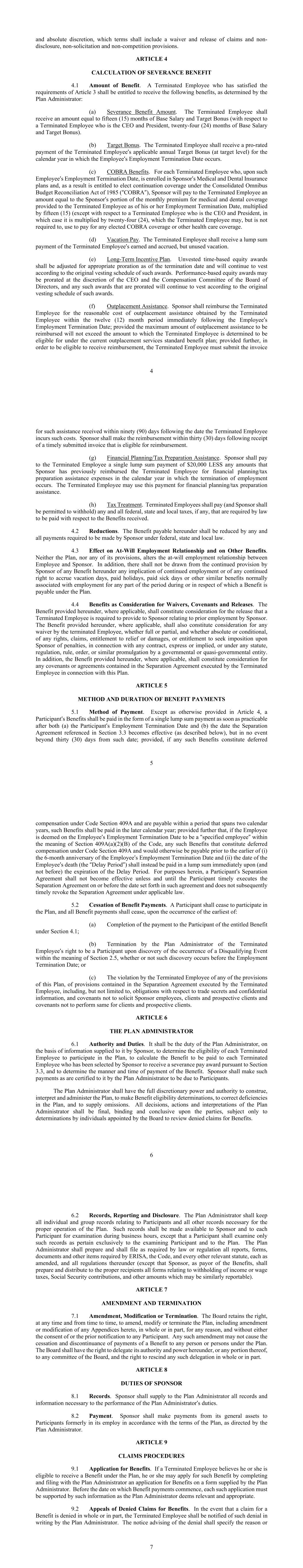 4 and absolute discretion, which terms shall include a waiver and release of claims and non- disclosure, non-solicitation and non-competition provisions. ARTICLE 4 CALCULATION OF SEVERANCE BENEFIT 4.1 Amount of Benefit. A Terminated Employee who has satisfied the requirements of Article 3 shall be entitled to receive the following benefits, as determined by the Plan Administrator: (a) Severance Benefit Amount. The Terminated Employee shall receive an amount equal to fifteen (15) months of Base Salary and Target Bonus (with respect to a Terminated Employee who is the CEO and President, twenty-four (24) months of Base Salary and Target Bonus). (b) Target Bonus. The Terminated Employee shall receive a pro-rated payment of the Terminated Employee’s applicable annual Target Bonus (at target level) for the calendar year in which the Employee’s Employment Termination Date occurs. (c) COBRA Benefits. For each Terminated Employee who, upon such Employee’s Employment Termination Date, is enrolled in Sponsor’s Medical and Dental Insurance plans and, as a result is entitled to elect continuation coverage under the Consolidated Omnibus Budget Reconciliation Act of 1985 (“COBRA”), Sponsor will pay to the Terminated Employee an amount equal to the Sponsor’s portion of the monthly premium for medical and dental coverage provided to the Terminated Employee as of his or her Employment Termination Date, multiplied by fifteen (15) (except with respect to a Terminated Employee who is the CEO and President, in which case it is multiplied by twenty-four (24), which the Terminated Employee may, but is not required to, use to pay for any elected COBRA coverage or other health care coverage. (d) Vacation Pay. The Terminated Employee shall receive a lump sum payment of the Terminated Employee’s earned and accrued, but unused vacation. (e) Long-Term Incentive Plan. Unvested time-based equity awards shall be adjusted for appropriate proration as of the termination date and will continue to vest according to the original vesting schedule of such awards. Performance-based equity awards may be prorated at the discretion of the CEO and the Compensation Committee of the Board of Directors, and any such awards that are prorated will continue to vest according to the original vesting schedule of such awards. (f) Outplacement Assistance. Sponsor shall reimburse the Terminated Employee for the reasonable cost of outplacement assistance obtained by the Terminated Employee within the twelve (12) month period immediately following the Employee’s Employment Termination Date; provided the maximum amount of outplacement assistance to be reimbursed will not exceed the amount to which the Terminated Employee is determined to be eligible for under the current outplacement services standard benefit plan; provided further, in order to be eligible to receive reimbursement, the Terminated Employee must submit the invoice 5 for such assistance received within ninety (90) days following the date the Terminated Employee incurs such costs. Sponsor shall make the reimbursement within thirty (30) days following receipt of a timely submitted invoice that is eligible for reimbursement. (g) Financial Planning/Tax Preparation Assistance. Sponsor shall pay to the Terminated Employee a single lump sum payment of $20,000 LESS any amounts that Sponsor has previously reimbursed the Terminated Employee for financial planning/tax preparation assistance expenses in the calendar year in which the termination of employment occurs. The Terminated Employee may use this payment for financial planning/tax preparation assistance. (h) Tax Treatment. Terminated Employees shall pay (and Sponsor shall be permitted to withhold) any and all federal, state and local taxes, if any, that are required by law to be paid with respect to the Benefits received. 4.2 Reductions. The Benefit payable hereunder shall be reduced by any and all payments required to be made by Sponsor under federal, state and local law. 4.3 Effect on At-Will Employment Relationship and on Other Benefits. Neither the Plan, nor any of its provisions, alters the at-will employment relationship between Employee and Sponsor. In addition, there shall not be drawn from the continued provision by Sponsor of any Benefit hereunder any implication of continued employment or of any continued right to accrue vacation days, paid holidays, paid sick days or other similar benefits normally associated with employment for any part of the period during or in respect of which a Benefit is payable under the Plan. 4.4 Benefits as Consideration for Waivers, Covenants and Releases. The Benefit provided hereunder, where applicable, shall constitute consideration for the release that a Terminated Employee is required to provide to Sponsor relating to prior employment by Sponsor. The Benefit provided hereunder, where applicable, shall also constitute consideration for any waiver by the terminated Employee, whether full or partial, and whether absolute or conditional, of any rights, claims, entitlement to relief or damages, or entitlement to seek imposition upon Sponsor of penalties, in connection with any contract, express or implied, or under any statute, regulation, rule, order, or similar promulgation by a governmental or quasi-governmental entity. In addition, the Benefit provided hereunder, where applicable, shall constitute consideration for any covenants or agreements contained in the Separation Agreement executed by the Terminated Employee in connection with this Plan. ARTICLE 5 METHOD AND DURATION OF BENEFIT PAYMENTS 5.1 Method of Payment. Except as otherwise provided in Article 4, a Participant’s Benefits shall be paid in the form of a single lump sum payment as soon as practicable after both (a) the Participant’s Employment Termination Date and (b) the date the Separation Agreement referenced in Section 3.3 becomes effective (as described below), but in no event beyond thirty (30) days from suc