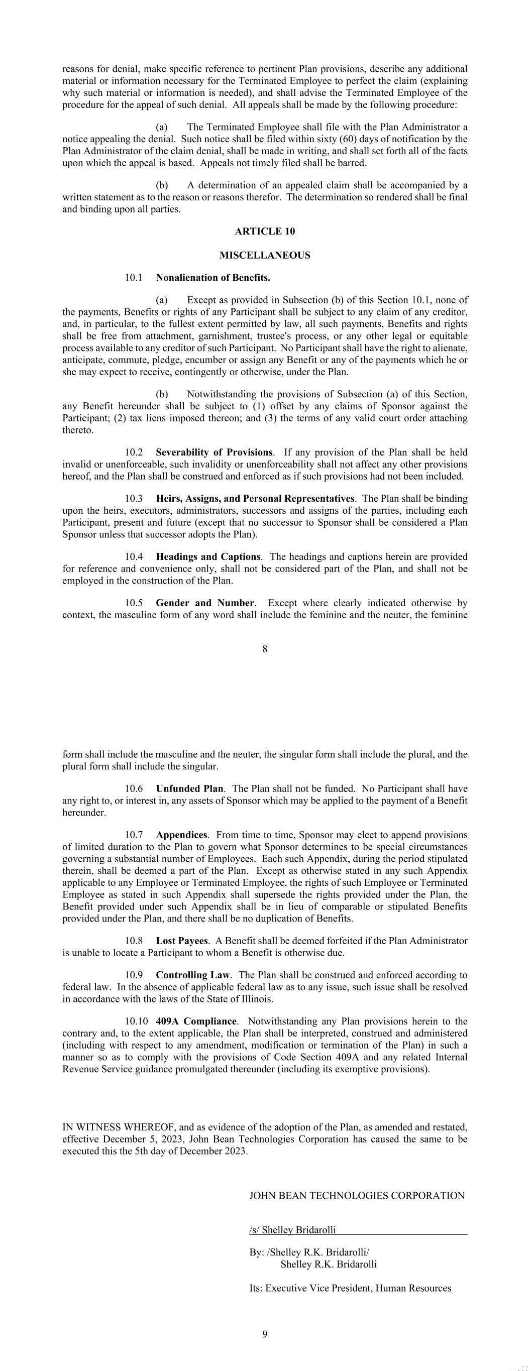 8 reasons for denial, make specific reference to pertinent Plan provisions, describe any additional material or information necessary for the Terminated Employee to perfect the claim (explaining why such material or information is needed), and shall advise the Terminated Employee of the procedure for the appeal of such denial. All appeals shall be made by the following procedure: (a) The Terminated Employee shall file with the Plan Administrator a notice appealing the denial. Such notice shall be filed within sixty (60) days of notification by the Plan Administrator of the claim denial, shall be made in writing, and shall set forth all of the facts upon which the appeal is based. Appeals not timely filed shall be barred. (b) A determination of an appealed claim shall be accompanied by a written statement as to the reason or reasons therefor. The determination so rendered shall be final and binding upon all parties. ARTICLE 10 MISCELLANEOUS 10.1 Nonalienation of Benefits. (a) Except as provided in Subsection (b) of this Section 10.1, none of the payments, Benefits or rights of any Participant shall be subject to any claim of any creditor, and, in particular, to the fullest extent permitted by law, all such payments, Benefits and rights shall be free from attachment, garnishment, trustee’s process, or any other legal or equitable process available to any creditor of such Participant. No Participant shall have the right to alienate, anticipate, commute, pledge, encumber or assign any Benefit or any of the payments which he or she may expect to receive, contingently or otherwise, under the Plan. (b) Notwithstanding the provisions of Subsection (a) of this Section, any Benefit hereunder shall be subject to (1) offset by any claims of Sponsor against the Participant; (2) tax liens imposed thereon; and (3) the terms of any valid court order attaching thereto. 10.2 Severability of Provisions. If any provision of the Plan shall be held invalid or unenforceable, such invalidity or unenforceability shall not affect any other provisions hereof, and the Plan shall be construed and enforced as if such provisions had not been included. 10.3 Heirs, Assigns, and Personal Representatives. The Plan shall be binding upon the heirs, executors, administrators, successors and assigns of the parties, including each Participant, present and future (except that no successor to Sponsor shall be considered a Plan Sponsor unless that successor adopts the Plan). 10.4 Headings and Captions. The headings and captions herein are provided for reference and convenience only, shall not be considered part of the Plan, and shall not be employed in the construction of the Plan. 10.5 Gender and Number. Except where clearly indicated otherwise by context, the masculine form of any word shall include the feminine and the neuter, the feminine 9 form shall include the masculine and the neuter, the singular form shall include the plural, and the plural form shall include the singular. 10.6 Unfunded Plan. The Plan shall not be funded. No Participant shall have any right to, or interest in, any assets of Sponsor which may be applied to the payment of a Benefit hereunder. 10.7 Appendices. From time to time, Sponsor may elect to append provisions of limited duration to the Plan to govern what Sponsor determines to be special circumstances governing a substantial number of Employees. Each such Appendix, during the period stipulated therein, shall be deemed a part of the Plan. Except as otherwise stated in any such Appendix applicable to any Employee or Terminated Employee, the rights of such Employee or Terminated Employee as stated in such Appendix shall supersede the rights provided under the Plan, the Benefit provided under such Appendix shall be in lieu of comparable or stipulated Benefits provided under the Plan, and there shall be no duplication of Benefits. 10.8 Lost Payees. A Benefit shall be deemed forfeited if the Plan Administrator is unable to locate a Participant to whom a Benefit is otherwise due. 10.9 Controlling Law. The Plan shall be construed and enforced according to federal law. In the absence of applicable federal law as to any issue, such issue shall be resolved in accordance with the laws of the State of Illinois. 10.10 409A Compliance. Notwithstanding any Plan provisions herein to the contrary and, to the extent applicable, the Plan shall be interpreted, construed and administered (including with respect to any amendment, modification or termination of the Plan) in such a manner so as to comply with the provisions of Code Section 409A and any related Internal Revenue Service guidance promulgated thereunder (including its exemptive provisions). IN WITNESS WHEREOF, and as evidence of the adoption of the Plan, as amended and restated, effective December 5, 2023, John Bean Technologies Corporation has caused the same to be executed this the 5th day of December 2023. JOHN BEAN TECHNOLOGIES CORPORATION /s/ Shelley Bridarolli By: /Shelley R.K. Bridarolli/ Shelley R.K. Bridarolli Its: Executive Vice President, Human Resources
