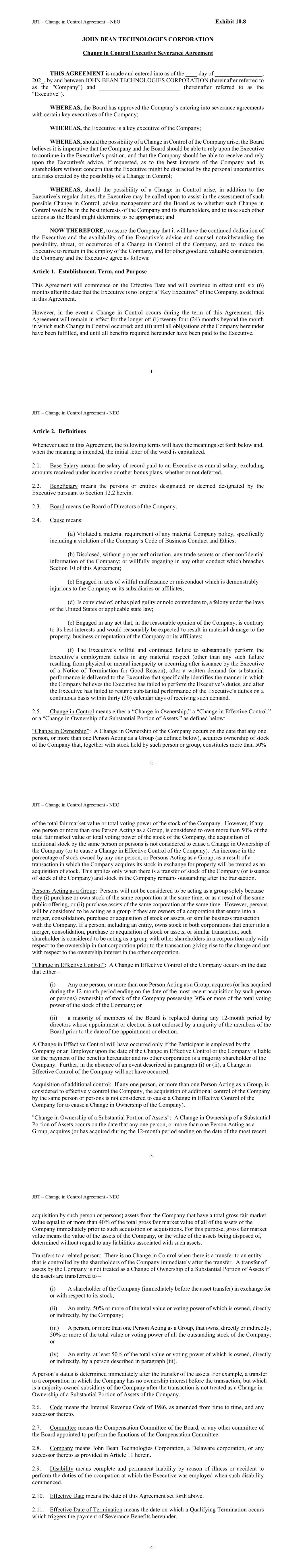 JBT – Change in Control Agreement – NEO Exhibit 10.8 -1- JOHN BEAN TECHNOLOGIES CORPORATION Change in Control Executive Severance Agreement THIS AGREEMENT is made and entered into as of the ____ day of ________________, 202_, by and between JOHN BEAN TECHNOLOGIES CORPORATION (hereinafter referred to as the "Company") and ___________________________ (hereinafter referred to as the "Executive"). WHEREAS, the Board has approved the Company’s entering into severance agreements with certain key executives of the Company; WHEREAS, the Executive is a key executive of the Company; WHEREAS, should the possibility of a Change in Control of the Company arise, the Board believes it is imperative that the Company and the Board should be able to rely upon the Executive to continue in the Executive’s position, and that the Company should be able to receive and rely upon the Executive's advice, if requested, as to the best interests of the Company and its shareholders without concern that the Executive might be distracted by the personal uncertainties and risks created by the possibility of a Change in Control; WHEREAS, should the possibility of a Change in Control arise, in addition to the Executive’s regular duties, the Executive may be called upon to assist in the assessment of such possible Change in Control, advise management and the Board as to whether such Change in Control would be in the best interests of the Company and its shareholders, and to take such other actions as the Board might determine to be appropriate; and NOW THEREFORE, to assure the Company that it will have the continued dedication of the Executive and the availability of the Executive’s advice and counsel notwithstanding the possibility, threat, or occurrence of a Change in Control of the Company, and to induce the Executive to remain in the employ of the Company, and for other good and valuable consideration, the Company and the Executive agree as follows: Article 1. Establishment, Term, and Purpose This Agreement will commence on the Effective Date and will continue in effect until six (6) months after the date that the Executive is no longer a “Key Executive” of the Company, as defined in this Agreement. However, in the event a Change in Control occurs during the term of this Agreement, this Agreement will remain in effect for the longer of: (i) twenty-four (24) months beyond the month in which such Change in Control occurred; and (ii) until all obligations of the Company hereunder have been fulfilled, and until all benefits required hereunder have been paid to the Executive. JBT – Change in Control Agreement - NEO -2- Article 2. Definitions Whenever used in this Agreement, the following terms will have the meanings set forth below and, when the meaning is intended, the initial letter of the word is capitalized. 2.1. Base Salary means the salary of record paid to an Executive as annual salary, excluding amounts received under incentive or other bonus plans, whether or not deferred. 2.2. Beneficiary means the persons or entities designated or deemed designated by the Executive pursuant to Section 12.2 herein. 2.3. Board means the Board of Directors of the Company. 2.4. Cause means: (a) Violated a material requirement of any material Company policy, specifically including a violation of the Company’s Code of Business Conduct and Ethics; (b) Disclosed, without proper authorization, any trade secrets or other confidential information of the Company; or willfully engaging in any other conduct which breaches Section 10 of this Agreement; (c) Engaged in acts of willful malfeasance or misconduct which is demonstrably injurious to the Company or its subsidiaries or affiliates; (d) Is convicted of, or has pled guilty or nolo contendere to, a felony under the laws of the United States or applicable state law; (e) Engaged in any act that, in the reasonable opinion of the Company, is contrary to its best interests and would reasonably be expected to result in material damage to the property, business or reputation of the Company or its affiliates; (f) The Executive's willful and continued failure to substantially perform the Executive’s employment duties in any material respect (other than any such failure resulting from physical or mental incapacity or occurring after issuance by the Executive of a Notice of Termination for Good Reason), after a written demand for substantial performance is delivered to the Executive that specifically identifies the manner in which the Company believes the Executive has failed to perform the Executive’s duties, and after the Executive has failed to resume substantial performance of the Executive’s duties on a continuous basis within thirty (30) calendar days of receiving such demand. 2.5. Change in Control means either a “Change in Ownership,” a “Change in Effective Control,” or a “Change in Ownership of a Substantial Portion of Assets,” as defined below: “Change in Ownership”: A Change in Ownership of the Company occurs on the date that any one person, or more than one Person Acting as a Group (as defined below), acquires ownership of stock of the Company that, together with stock held by such person or group, constitutes more than 50% JBT – Change in Control Agreement - NEO -3- of the total fair market value or total voting power of the stock of the Company. However, if any one person or more than one Person Acting as a Group, is considered to own more than 50% of the total fair market value or total voting power of the stock of the Company, the acquisition of additional stock by the same person or persons is not considered to cause a Change in Ownership of the Company (or to cause a Change in Effective Control of the Company). An increase in the percentage of stock owned by any one person, or Persons Acting as a Group, as a result of a transaction in which the Company acquires its stock in exchange for property will be treated as an acquisition of stock. T