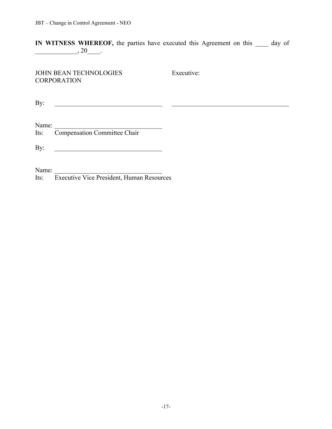 JBT – Change in Control Agreement - NEO -17- IN WITNESS WHEREOF, the parties have executed this Agreement on this ____ day of _____________, 20____. JOHN BEAN TECHNOLOGIES Executive: CORPORATION By: _________________________________ ____________________________________ Name: _________________________________ Its: Compensation Committee Chair By: _________________________________ Name: _________________________________ Its: Executive Vice President, Human Resources