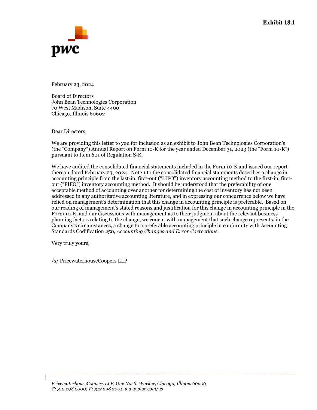 Exhibit 18.1 PricewaterhouseCoopers LLP, One North Wacker, Chicago, Illinois 60606 T: 312 298 2000; F: 312 298 2001, www.pwc.com/us February 23, 2024 Board of Directors John Bean Technologies Corporation 70 West Madison, Suite 4400 Chicago, Illinois 60602 Dear Directors: We are providing this letter to you for inclusion as an exhibit to John Bean Technologies Corporation’s (the “Company”) Annual Report on Form 10-K for the year ended December 31, 2023 (the “Form 10-K”) pursuant to Item 601 of Regulation S-K. We have audited the consolidated financial statements included in the Form 10-K and issued our report thereon dated February 23, 2024. Note 1 to the consolidated financial statements describes a change in accounting principle from the last-in, first-out (“LIFO”) inventory accounting method to the first-in, first- out (“FIFO”) inventory accounting method. It should be understood that the preferability of one acceptable method of accounting over another for determining the cost of inventory has not been addressed in any authoritative accounting literature, and in expressing our concurrence below we have relied on management’s determination that this change in accounting principle is preferable. Based on our reading of management’s stated reasons and justification for this change in accounting principle in the Form 10-K, and our discussions with management as to their judgment about the relevant business planning factors relating to the change, we concur with management that such change represents, in the Company’s circumstances, a change to a preferable accounting principle in conformity with Accounting Standards Codification 250, Accounting Changes and Error Corrections. Very truly yours, /s/ PricewaterhouseCoopers LLP