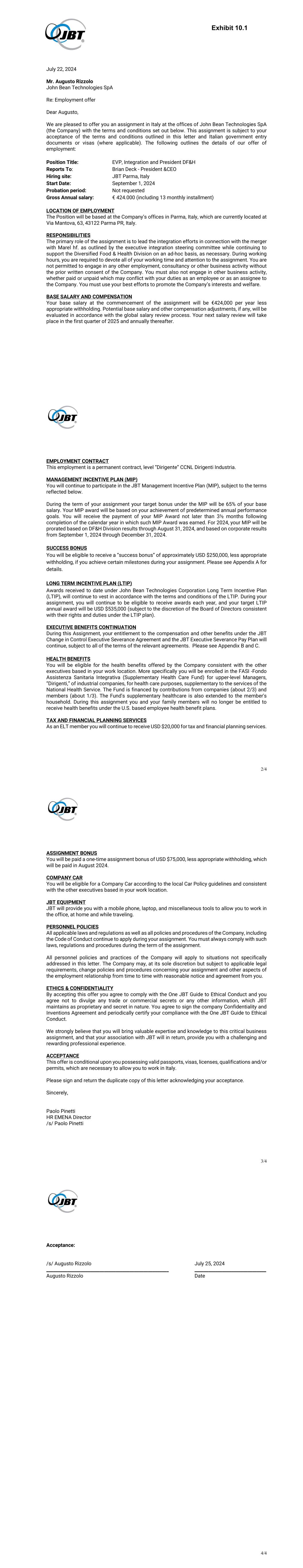 Exhibit 10.1 July 22, 2024 Mr. Augusto Rizzolo John Bean Technologies SpA Re: Employment offer Dear Augusto, We are pleased to offer you an assignment in Italy at the offices of John Bean Technologies SpA (the Company) with the terms and conditions set out below. This assignment is subject to your acceptance of the terms and conditions outlined in this letter and Italian government entry documents or visas (where applicable). The following outlines the details of our offer of employment: Position Title: EVP, Integration and President DF&H Reports To: Brian Deck - President &CEO Hiring site: JBT Parma, Italy Start Date: September 1, 2024 Probation period: Not requested Gross Annual salary: € 424.000 (including 13 monthly installment) LOCATION OF EMPLOYMENT The Position will be based at the Company’s offices in Parma, Italy, which are currently located at Via Mantova, 63, 43122 Parma PR, Italy. RESPONSIBILITIES The primary role of the assignment is to lead the integration efforts in connection with the merger with Marel hf. as outlined by the executive integration steering committee while continuing to support the Diversified Food & Health Division on an ad-hoc basis, as necessary. During working hours, you are required to devote all of your working time and attention to the assignment. You are not permitted to engage in any other employment, consultancy or other business activity without the prior written consent of the Company. You must also not engage in other business activity, whether paid or unpaid which may conflict with your duties as an employee or as an assignee to the Company. You must use your best efforts to promote the Company’s interests and welfare. BASE SALARY AND COMPENSATION Your base salary at the commencement of the assignment will be €424,000 per year less appropriate withholding. Potential base salary and other compensation adjustments, if any, will be evaluated in accordance with the global salary review process. Your next salary review will take place in the first quarter of 2025 and annually thereafter. 2/4 EMPLOYMENT CONTRACT This employment is a permanent contract, level “Dirigente” CCNL Dirigenti Industria. MANAGEMENT INCENTIVE PLAN (MIP) You will continue to participate in the JBT Management Incentive Plan (MIP), subject to the terms reflected below. During the term of your assignment your target bonus under the MIP will be 65% of your base salary. Your MIP award will be based on your achievement of predetermined annual performance goals. You will receive the payment of your MIP Award not later than 3½ months following completion of the calendar year in which such MIP Award was earned. For 2024, your MIP will be prorated based on DF&H Division results through August 31, 2024, and based on corporate results from September 1, 2024 through December 31, 2024. SUCCESS BONUS You will be eligible to receive a “success bonus” of approximately USD $250,000, less appropriate withholding, if you achieve certain milestones during your assignment. Please see Appendix A for details. LONG TERM INCENTIVE PLAN (LTIP) Awards received to date under John Bean Technologies Corporation Long Term Incentive Plan (LTIP), will continue to vest in accordance with the terms and conditions of the LTIP. During your assignment, you will continue to be eligible to receive awards each year, and your target LTIP annual award will be USD $535,000 (subject to the discretion of the Board of Directors consistent with their rights and duties under the LTIP plan). EXECUTIVE BENEFITS CONTINUATION During this Assignment, your entitlement to the compensation and other benefits under the JBT Change in Control Executive Severance Agreement and the JBT Executive Severance Pay Plan will continue, subject to all of the terms of the relevant agreements. Please see Appendix B and C. HEALTH BENEFITS You will be eligible for the health benefits offered by the Company consistent with the other executives based in your work location. More specifically you will be enrolled in the FASI -Fondo Assistenza Sanitaria Integrativa (Supplementary Health Care Fund) for upper-level Managers, “Dirigenti,” of industrial companies, for health care purposes, supplementary to the services of the National Health Service. The Fund is financed by contributions from companies (about 2/3) and members (about 1/3). The Fund's supplementary healthcare is also extended to the member's household. During this assignment you and your family members will no longer be entitled to receive health benefits under the U.S. based employee health benefit plans. TAX AND FINANCIAL PLANNING SERVICES As an ELT member you will continue to receive USD $20,000 for tax and financial planning services. 3/4 ASSIGNMENT BONUS You will be paid a one-time assignment bonus of USD $75,000, less appropriate withholding, which will be paid in August 2024. COMPANY CAR You will be eligible for a Company Car according to the local Car Policy guidelines and consistent with the other executives based in your work location. JBT EQUIPMENT JBT will provide you with a mobile phone, laptop, and miscellaneous tools to allow you to work in the office, at home and while traveling. PERSONNEL POLICIES All applicable laws and regulations as well as all policies and procedures of the Company, including the Code of Conduct continue to apply during your assignment. You must always comply with such laws, regulations and procedures during the term of the assignment. All personnel policies and practices of the Company will apply to situations not specifically addressed in this letter. The Company may, at its sole discretion but subject to applicable legal requirements, change policies and procedures concerning your assignment and other aspects of the employment relationship from time to time with reasonable notice and agreement from you. ETHICS & CONFIDENTIALITY By accepting this offer you agree to comply with the One JBT Guide to Ethical Conduct and you agree not to 