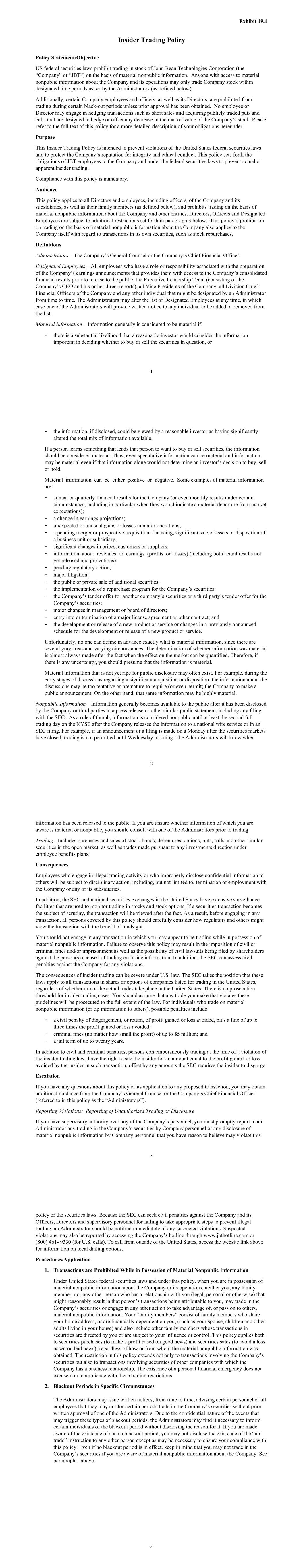 Exhibit 19.1 1 Insider Trading Policy Policy Statement/Objective US federal securities laws prohibit trading in stock of John Bean Technologies Corporation (the “Company” or “JBT”) on the basis of material nonpublic information. Anyone with access to material nonpublic information about the Company and its operations may only trade Company stock within designated time periods as set by the Administrators (as defined below). Additionally, certain Company employees and officers, as well as its Directors, are prohibited from trading during certain black-out periods unless prior approval has been obtained. No employee or Director may engage in hedging transactions such as short sales and acquiring publicly traded puts and calls that are designed to hedge or offset any decrease in the market value of the Company’s stock. Please refer to the full text of this policy for a more detailed description of your obligations hereunder. Purpose This Insider Trading Policy is intended to prevent violations of the United States federal securities laws and to protect the Company’s reputation for integrity and ethical conduct. This policy sets forth the obligations of JBT employees to the Company and under the federal securities laws to prevent actual or apparent insider trading. Compliance with this policy is mandatory. Audience This policy applies to all Directors and employees, including officers, of the Company and its subsidiaries, as well as their family members (as defined below), and prohibits trading on the basis of material nonpublic information about the Company and other entities. Directors, Officers and Designated Employees are subject to additional restrictions set forth in paragraph 3 below. This policy’s prohibition on trading on the basis of material nonpublic information about the Company also applies to the Company itself with regard to transactions in its own securities, such as stock repurchases. Definitions Administrators – The Company’s General Counsel or the Company’s Chief Financial Officer. Designated Employees – All employees who have a role or responsibility associated with the preparation of the Company’s earnings announcements that provides them with access to the Company’s consolidated financial results prior to release to the public, the Executive Leadership Team (consisting of the Company’s CEO and his or her direct reports), all Vice Presidents of the Company, all Division Chief Financial Officers of the Company and any other individual that might be designated by an Administrator from time to time. The Administrators may alter the list of Designated Employees at any time, in which case one of the Administrators will provide written notice to any individual to be added or removed from the list. Material Information – Information generally is considered to be material if: - there is a substantial likelihood that a reasonable investor would consider the information important in deciding whether to buy or sell the securities in question, or 2 - the information, if disclosed, could be viewed by a reasonable investor as having significantly altered the total mix of information available. If a person learns something that leads that person to want to buy or sell securities, the information should be considered material. Thus, even speculative information can be material and information may be material even if that information alone would not determine an investor’s decision to buy, sell or hold. Material information can be either positive or negative. Some examples of material information are: - annual or quarterly financial results for the Company (or even monthly results under certain circumstances, including in particular when they would indicate a material departure from market expectations); - a change in earnings projections; - unexpected or unusual gains or losses in major operations; - a pending merger or prospective acquisition; financing, significant sale of assets or disposition of a business unit or subsidiary; - significant changes in prices, customers or suppliers; - information about revenues or earnings (profits or losses) (including both actual results not yet released and projections); - pending regulatory action; - major litigation; - the public or private sale of additional securities; - the implementation of a repurchase program for the Company’s securities; - the Company’s tender offer for another company’s securities or a third party’s tender offer for the Company’s securities; - major changes in management or board of directors; - entry into or termination of a major license agreement or other contract; and - the development or release of a new product or service or changes in a previously announced schedule for the development or release of a new product or service. Unfortunately, no one can define in advance exactly what is material information, since there are several gray areas and varying circumstances. The determination of whether information was material is almost always made after the fact when the effect on the market can be quantified. Therefore, if there is any uncertainty, you should presume that the information is material. Material information that is not yet ripe for public disclosure may often exist. For example, during the early stages of discussions regarding a significant acquisition or disposition, the information about the discussions may be too tentative or premature to require (or even permit) the Company to make a public announcement. On the other hand, that same information may be highly material. Nonpublic Information – Information generally becomes available to the public after it has been disclosed by the Company or third parties in a press release or other similar public statement, including any filing with the SEC. As a rule of thumb, information is considered nonpublic until at least the second full trading day on the NYSE after the Company releases the information to a national wi
