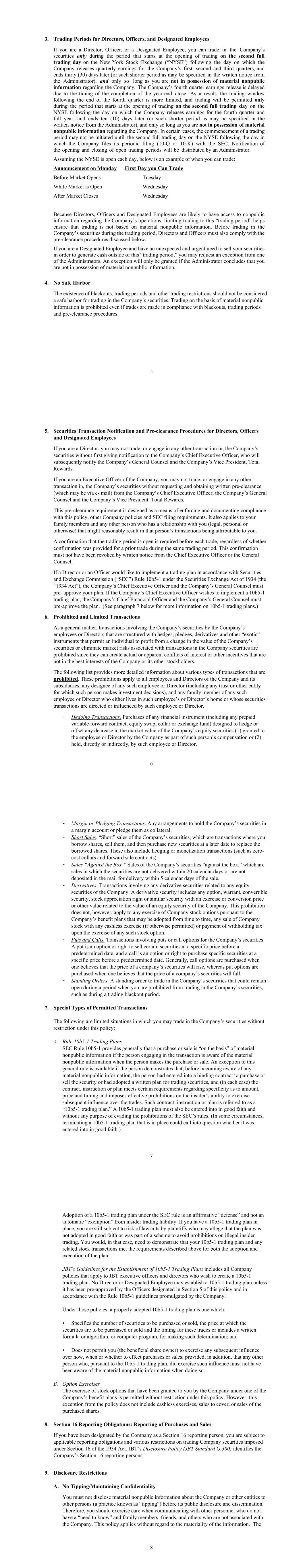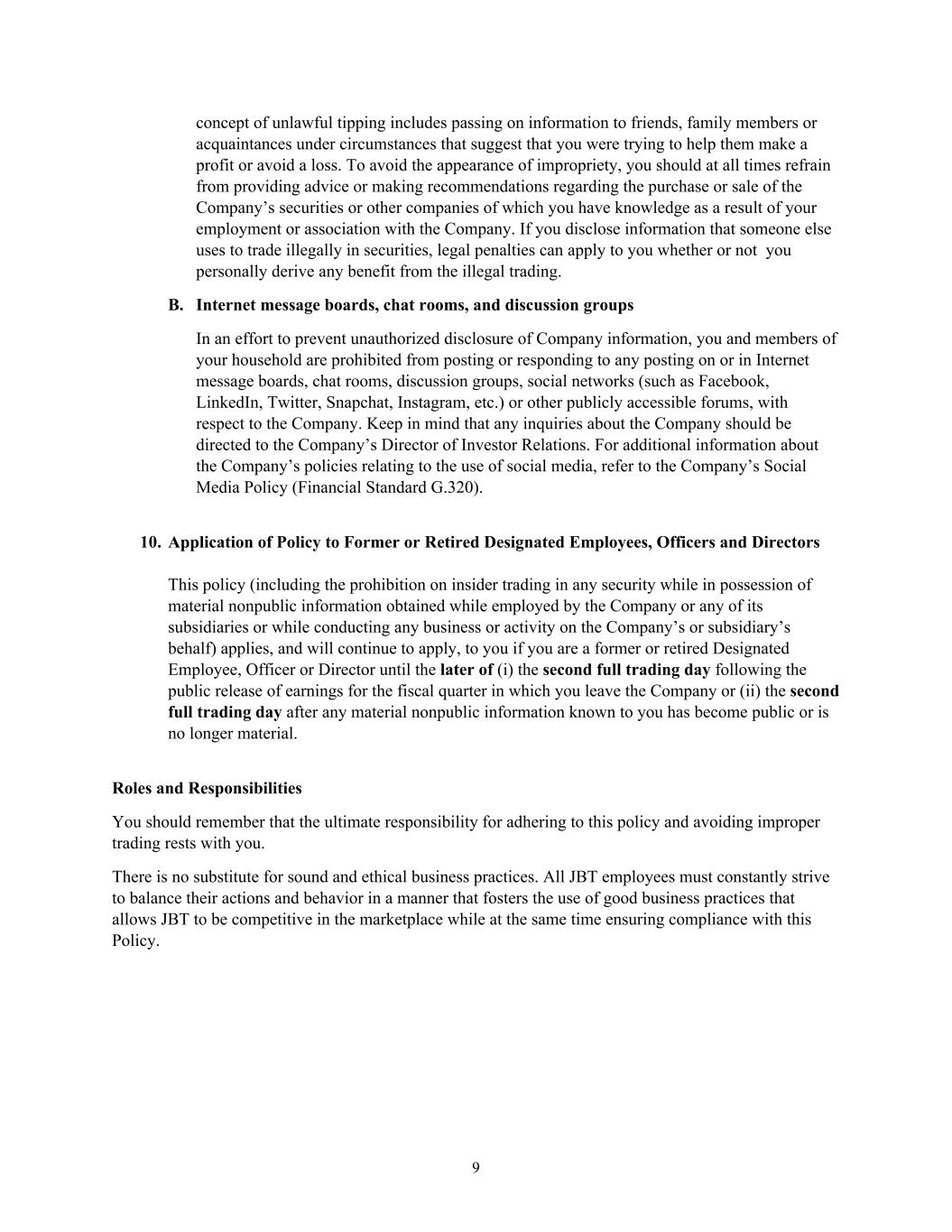 9 concept of unlawful tipping includes passing on information to friends, family members or acquaintances under circumstances that suggest that you were trying to help them make a profit or avoid a loss. To avoid the appearance of impropriety, you should at all times refrain from providing advice or making recommendations regarding the purchase or sale of the Company’s securities or other companies of which you have knowledge as a result of your employment or association with the Company. If you disclose information that someone else uses to trade illegally in securities, legal penalties can apply to you whether or not you personally derive any benefit from the illegal trading. B. Internet message boards, chat rooms, and discussion groups In an effort to prevent unauthorized disclosure of Company information, you and members of your household are prohibited from posting or responding to any posting on or in Internet message boards, chat rooms, discussion groups, social networks (such as Facebook, LinkedIn, Twitter, Snapchat, Instagram, etc.) or other publicly accessible forums, with respect to the Company. Keep in mind that any inquiries about the Company should be directed to the Company’s Director of Investor Relations. For additional information about the Company’s policies relating to the use of social media, refer to the Company’s Social Media Policy (Financial Standard G.320). 10. Application of Policy to Former or Retired Designated Employees, Officers and Directors This policy (including the prohibition on insider trading in any security while in possession of material nonpublic information obtained while employed by the Company or any of its subsidiaries or while conducting any business or activity on the Company’s or subsidiary’s behalf) applies, and will continue to apply, to you if you are a former or retired Designated Employee, Officer or Director until the later of (i) the second full trading day following the public release of earnings for the fiscal quarter in which you leave the Company or (ii) the second full trading day after any material nonpublic information known to you has become public or is no longer material. Roles and Responsibilities You should remember that the ultimate responsibility for adhering to this policy and avoiding improper trading rests with you. There is no substitute for sound and ethical business practices. All JBT employees must constantly strive to balance their actions and behavior in a manner that fosters the use of good business practices that allows JBT to be competitive in the marketplace while at the same time ensuring compliance with this Policy.