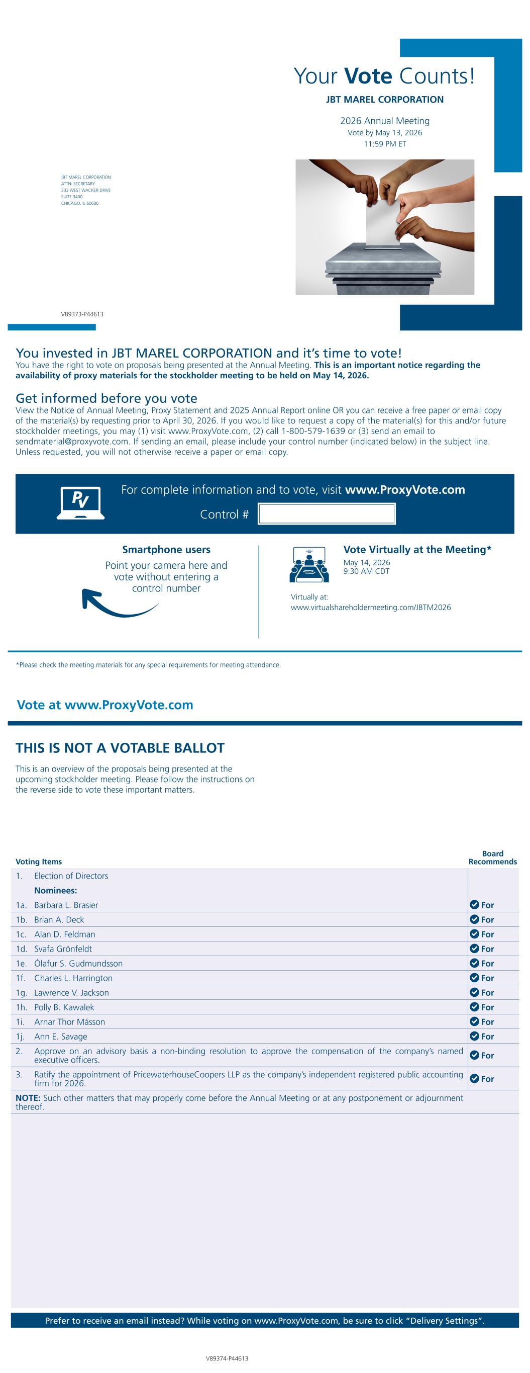 Your Vote Counts! *Please check the meeting materials for any special requirements for meeting attendance. Smartphone users Point your camera here and vote without entering a control number For complete information and to vote, visit www.ProxyVote.com Control # V89373-P44613 You invested in JBT MAREL CORPORATION and it’s time to vote! You have the right to vote on proposals being presented at the Annual Meeting. This is an important notice regarding the availability of proxy materials for the stockholder meeting to be held on May 14, 2026. JBT MAREL CORPORATION ATTN: SECRETARY 333 WEST WACKER DRIVE SUITE 3400 CHICAGO, IL 60606 JBT MAREL CORPORATION 2026 Annual Meeting Vote by May 13, 2026 11:59 PM ET Get informed before you vote View the Notice of Annual Meeting, Proxy Statement and 2025 Annual Report online OR you can receive a free paper or email copy of the material(s) by requesting prior to April 30, 2026. If you would like to request a copy of the material(s) for this and/or future stockholder meetings, you may (1) visit www.ProxyVote.com, (2) call 1-800-579-1639 or (3) send an email to sendmaterial@proxyvote.com. If sending an email, please include your control number (indicated below) in the subject line. Unless requested, you will not otherwise receive a paper or email copy. Vote Virtually at the Meeting* May 14, 2026 9:30 AM CDT Virtually at: www.virtualshareholdermeeting.com/JBTM2026 Vote at www.ProxyVote.com Prefer to receive an email instead? While voting on www.ProxyVote.com, be sure to click “Delivery Settings”. Voting Items Board Recommends V89374-P44613 THIS IS NOT A VOTABLE BALLOT This is an overview of the proposals being presented at the upcoming stockholder meeting. Please follow the instructions on the reverse side to vote these important matters. 1. Election of Directors Nominees: 1a. Barbara L. Brasier For 1b. Brian A. Deck For 1c. Alan D. Feldman For 1d. Svafa Grönfeldt For 1e. Ólafur S. Gudmundsson For 1f. Charles L. Harrington For 1g. Lawrence V. Jackson For 1h. Polly B. Kawalek For 1i. Arnar Thor Másson For 1j. Ann E. Savage For 2. Approve on an advisory basis a non-binding resolution to approve the compensation of the company’s named executive officers. For 3. Ratify the appointment of PricewaterhouseCoopers LLP as the company’s independent registered public accounting firm for 2026. For NOTE: Such other matters that may properly come before the Annual Meeting or at any postponement or adjournment thereof.