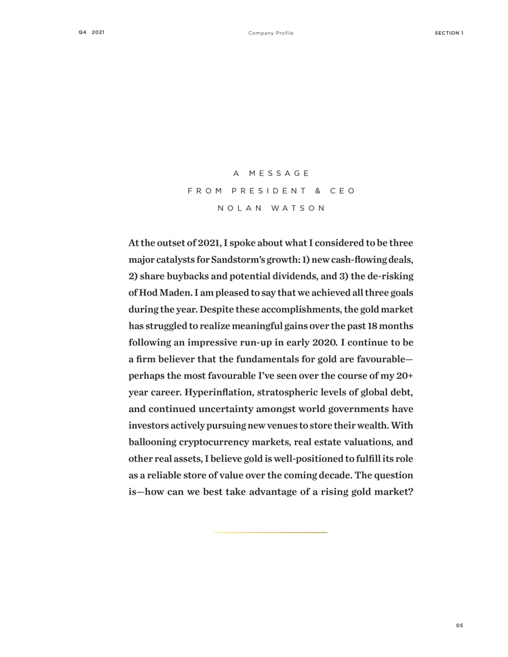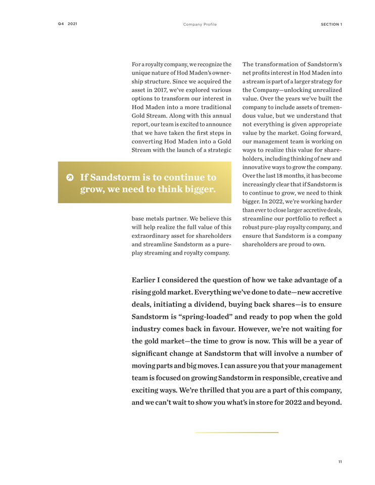 Subsequent to year end, the Company announced that it had reached an agreement with Royalty North Partners Ltd. to sell its 30% interest in Hod Maden and its equity interest in Entrée. In consideration, Sandstorm will receive a flagship Gold Stream on Hod Maden and a portion of debt and equity in the resulting New-Co. The transaction is subject to various closing conditions and is expected to close in the second half of 2022. With this transaction, Sandstorm intends to unlock additional value in Hod Maden through the re-rating of the asset as a Gold Stream in its portfolio and further repositions Sandstorm as a pure-play precious metals royalty and streaming company. |