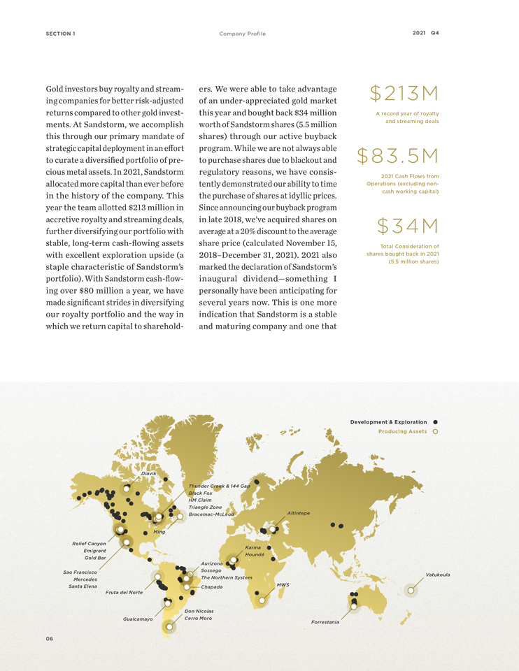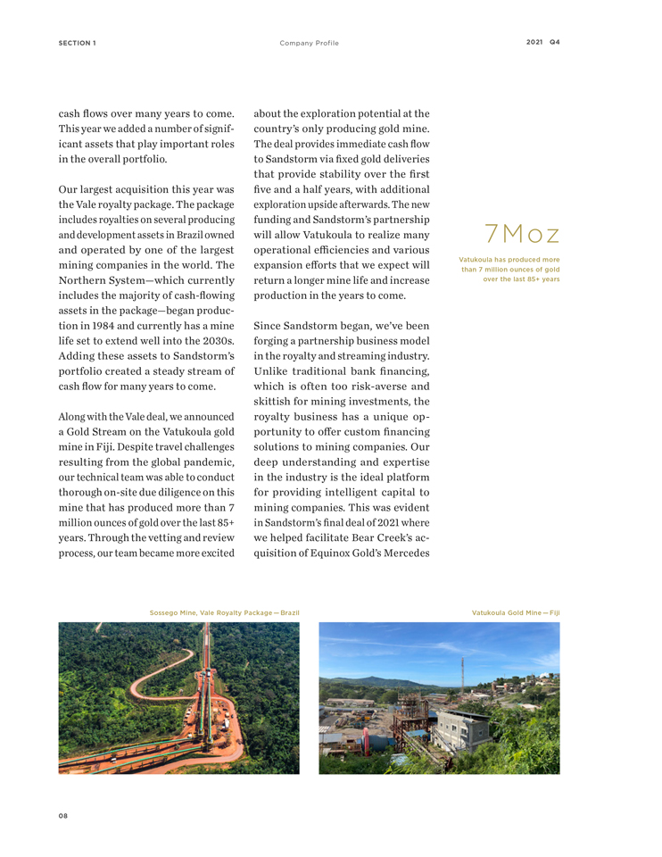 In June 2021, the Company acquired a diverse package of Vale Royalties which provide holders with life of mine net sales royalties on certain of Vale’s producing and exploration assets. The royalties provide exposure to several of Vale’s long-life, low-cost assets and are expected to contribute to Sandstorm’s portfolio for several decades. |