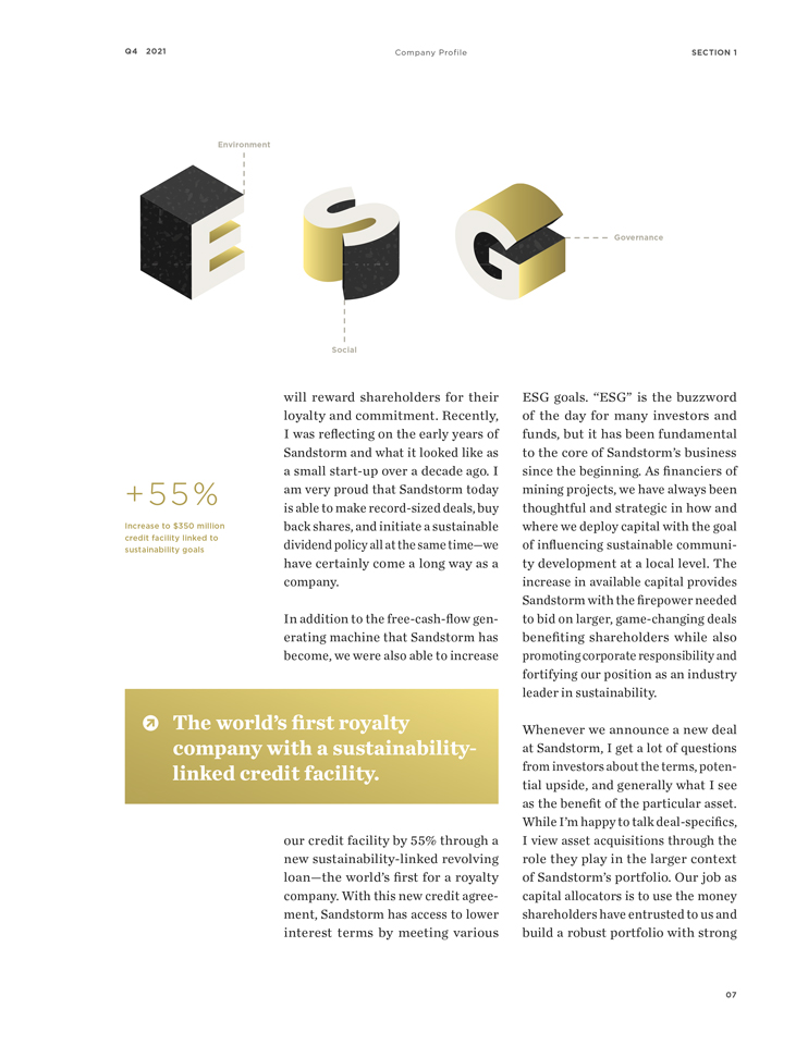 On October 6, 2021, Sandstorm amended its revolving credit agreement allowing the Company to borrow up to $350 million, and incorporated sustainability-linked performance targets to become the first royalty company to establish an Environment, Social, and Governance linked credit facility. The ESG Revolving Facility incorporates sustainability-linked incentive pricing terms that allow Sandstorm to reduce borrowing costs as the Company’s sustainability performance targets are met. The tenure of the facility is four years and is extendable by mutual consent of Sandstorm and the banking syndicate. |