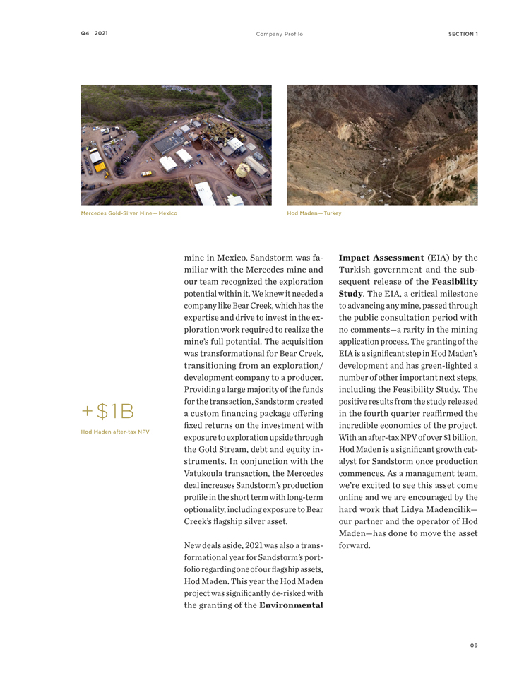 In November 2021, the Company announced the results of the Hod Maden Feasibility Study, for which Sandstorm holds a 30% interest. The study projects a pre-tax net present value (5% discount rate) of $1.3 billion and an internal rate of return of 41%. The study also outlines total production of more than 2.5 million gold equivalent ounces over a 13 year mine life and it is expected that gold will be produced at an all-in sustaining cost on a by-product basis of $334 per ounce1 |