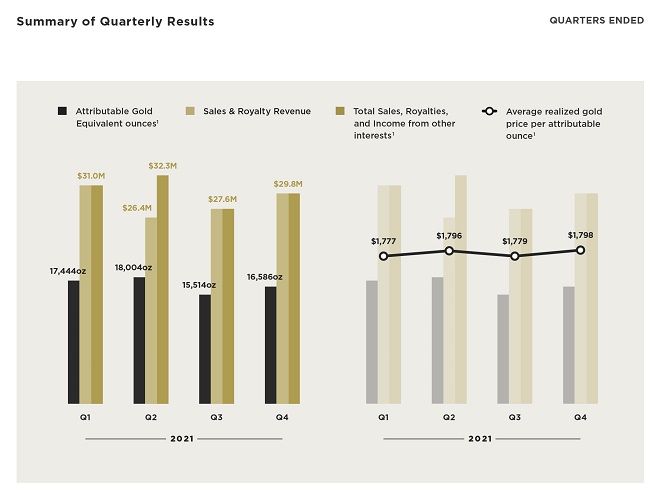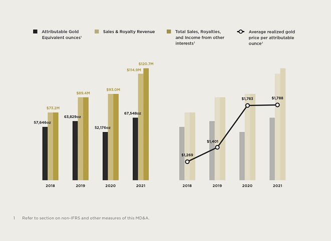 Total Sales, Royalties and Income from other interests 1 (as defined hereinafter) for the three months and year ended December 31, 2021 was $29.8 million and $120.7 million, respectively, compared with $29.7 million and $93.0 million for the comparable periods in 2020. Total Sales, Royalties and Income from other interests1 for the most recently completed year represented a record for the Company. |