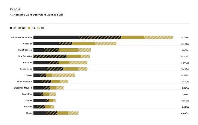 3 | Where a stream and royalty interest represents less than 10% of the Company’s sales, gross margin or aggregate asset book value and represents an interest on gold, silver or other metal, the interest has been summarized under Other. Includes Mt. Hamilton, Prairie Creek, Gualcamayo, Emigrant Springs, Mine Waste Solutions, Thunder Creek, Hackett River, Lobo-Marte, Agi Dagi & Kirazli, HM Claim, Triangle Zone, Ming, and others. |