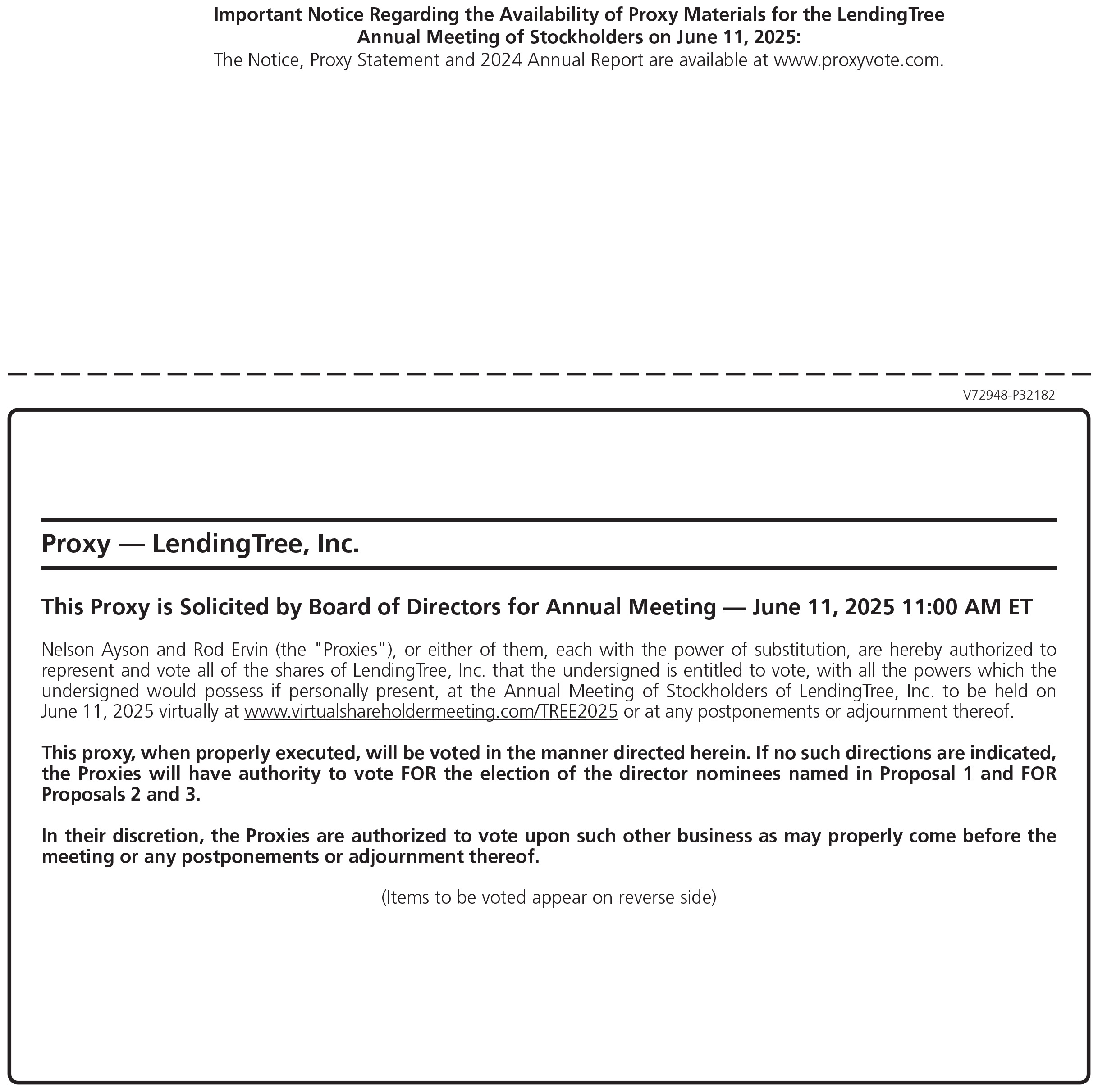 Your vote is important. Please vote as promptly as possible. Important Notice Regarding the Availability of Proxy Materials for the Annual Meeting of Stockholders to Be Held on June 11, 2025 (the “Meeting” or “Annual Meeting”): Both the Proxy Statement and LendingTree’s Annual Report on Form 10-K for the fiscal year ended December 31, 2024 (the “2024 Annual Report”), are available electronically at: www.proxyvote.com |