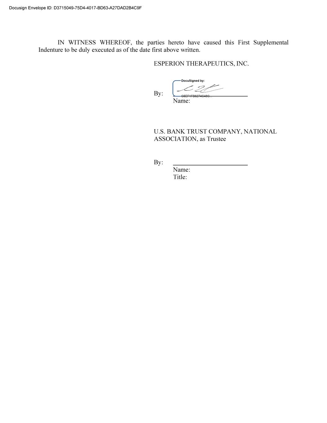IN WITNESS WHEREOF, the parties hereto have caused this First Supplemental Indenture to be duly executed as of the date first above written. ESPERION THERAPEUTICS, INC. By: Name: Title: U.S. BANK TRUST COMPANY, NATIONAL ASSOCIATION, as Trustee By: Name: Title: Joshua A. Hahn Vice President