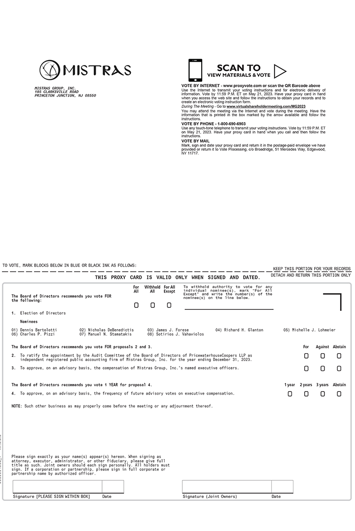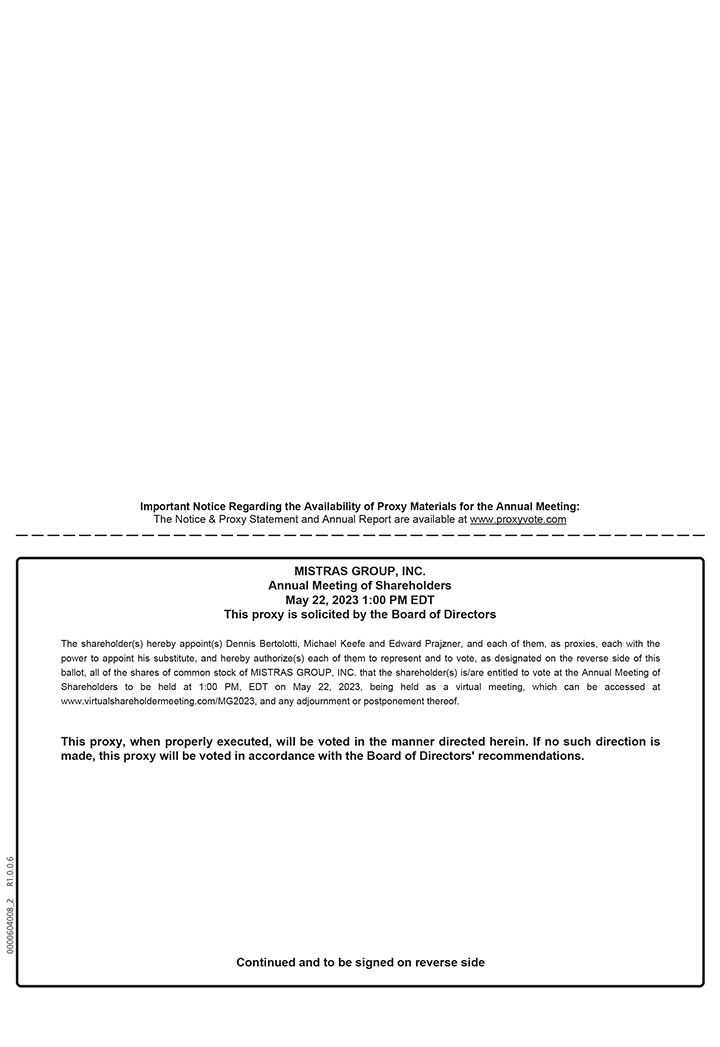 I am pleased to invite you to attend the 2023 Annual Shareholders Meeting of Mistras Group, Inc. The meeting will be held on Monday, May 22, 2023, at 1:00 p.m., Eastern Time. The annual meeting will be conducted completely virtual, via a live webcast. You will be able to attend and participate in our annual meeting by visiting www.virtualshareholdermeeting.com/MG2023, where you will be able to listen to the meeting live, vote your shares and submit questions. There will be no physical meeting location.