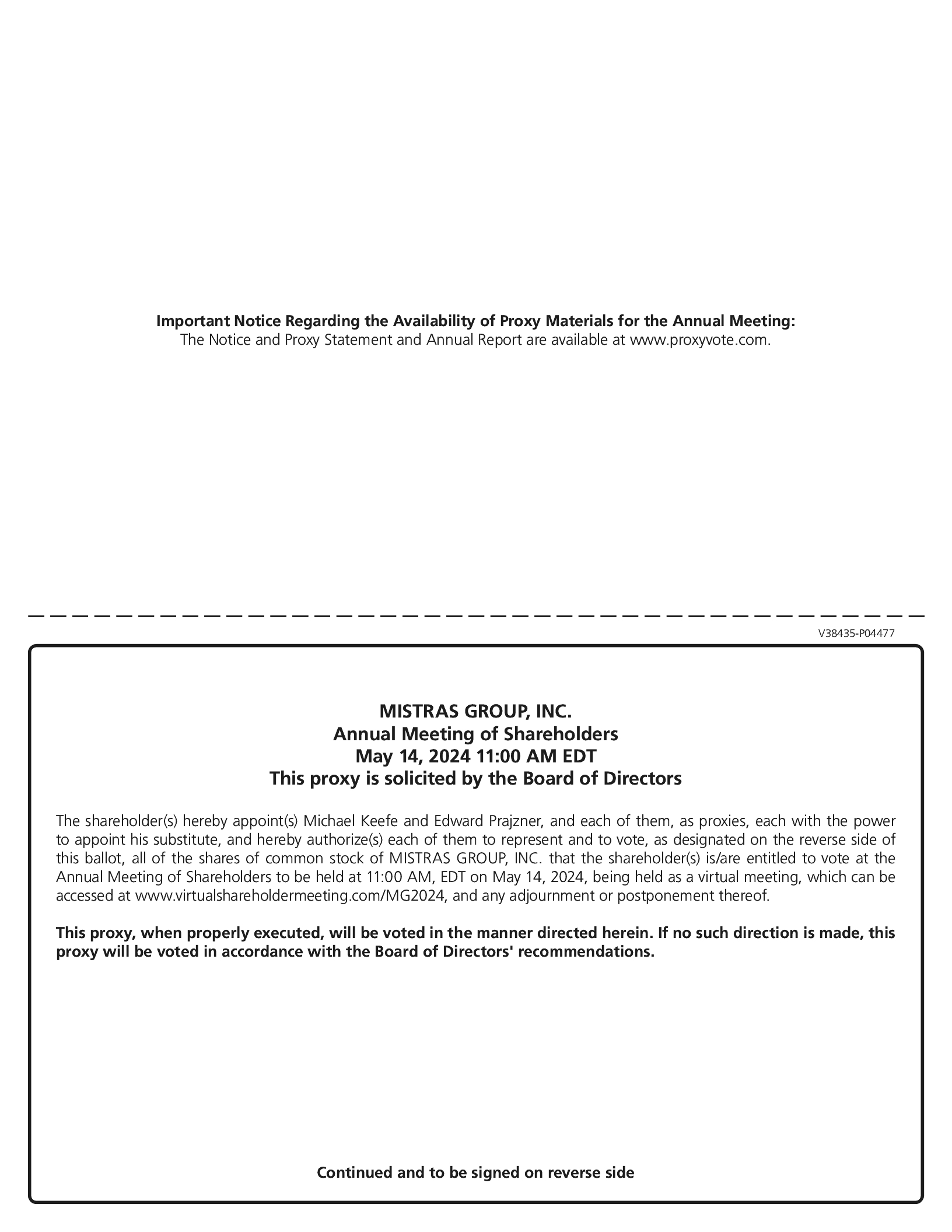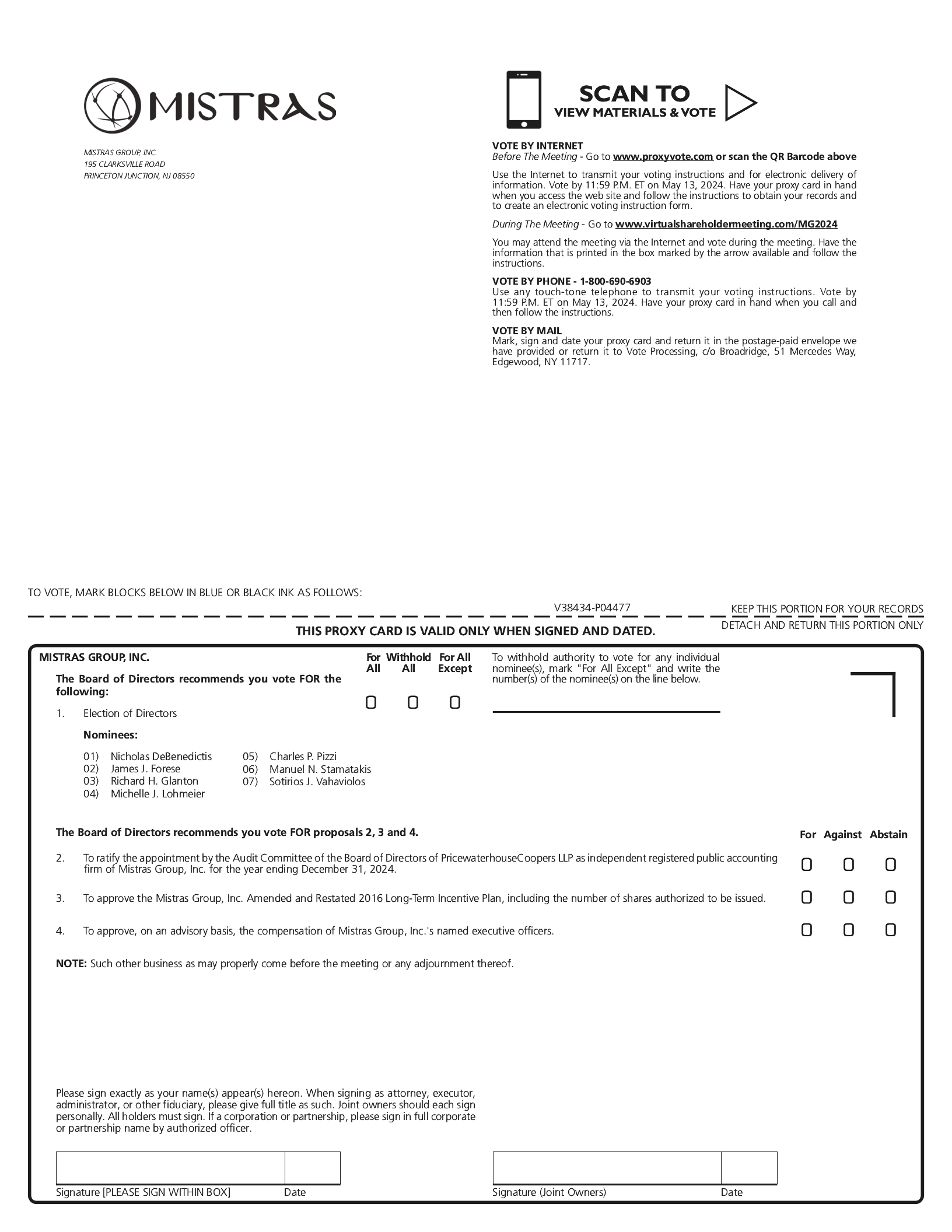 • | To ratify the appointment by the Audit Committee of the Board of Directors of PricewaterhouseCoopers LLP as the independent registered public accounting firm of Mistras Group, Inc. for the year ending December 31, 2024; |