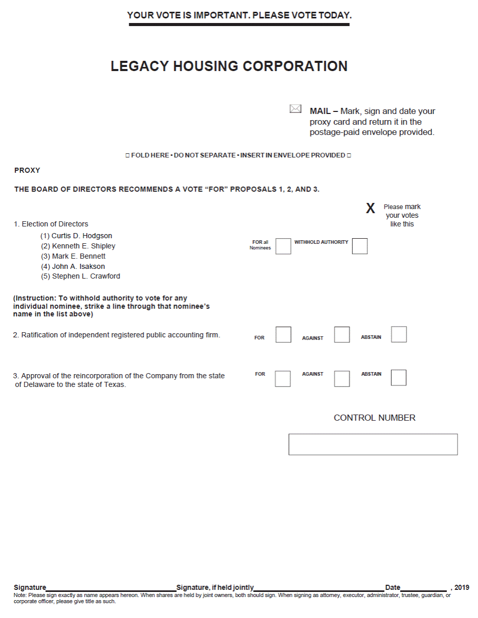YOUR VOTE IS IMPORTANT. PLEASE VOTE TODAY. LEGACY HOUSING CORPORATION MAIL – Mark, sign and date your proxy card and return it in the postage-paid envelope provided. FOLD HERE • DO NOT SEPARATE • INSERT IN ENVELOPE PROVIDED PROXY THE BOARD OF DIRECTORS RECOMMENDS A VOTE “FOR” PROPOSALS 1, 2, AND 3. X Please mark your votes like this 1. Election of Directors (1) Curtis D. Hodgson (2) Kenneth E. Shipley (3) Mark E. Bennett (4) John A. Isakson (5) Stephen L. Crawford FOR all Nominees WITHHOLD AUTHORITY (Instruction: To withhold authority to vote for any individual nominee, strike a line through that nominee’s name in the list above) 2. Ratification of independent registered public accounting firm. ABSTAIN FOR AGAINST FOR AGAINST ABSTAIN 3. Approval of the reincorporation of the Company from the state of Delaware to the state of Texas. CONTROL NUMBER Signature Signature, if held jointly Date , 2019 Note: Please sign exactly as name appears hereon. When shares are held by joint owners, both should sign. When signing as attorney, executor, administrator, trustee, guardian, or corporate officer, please give title as such.