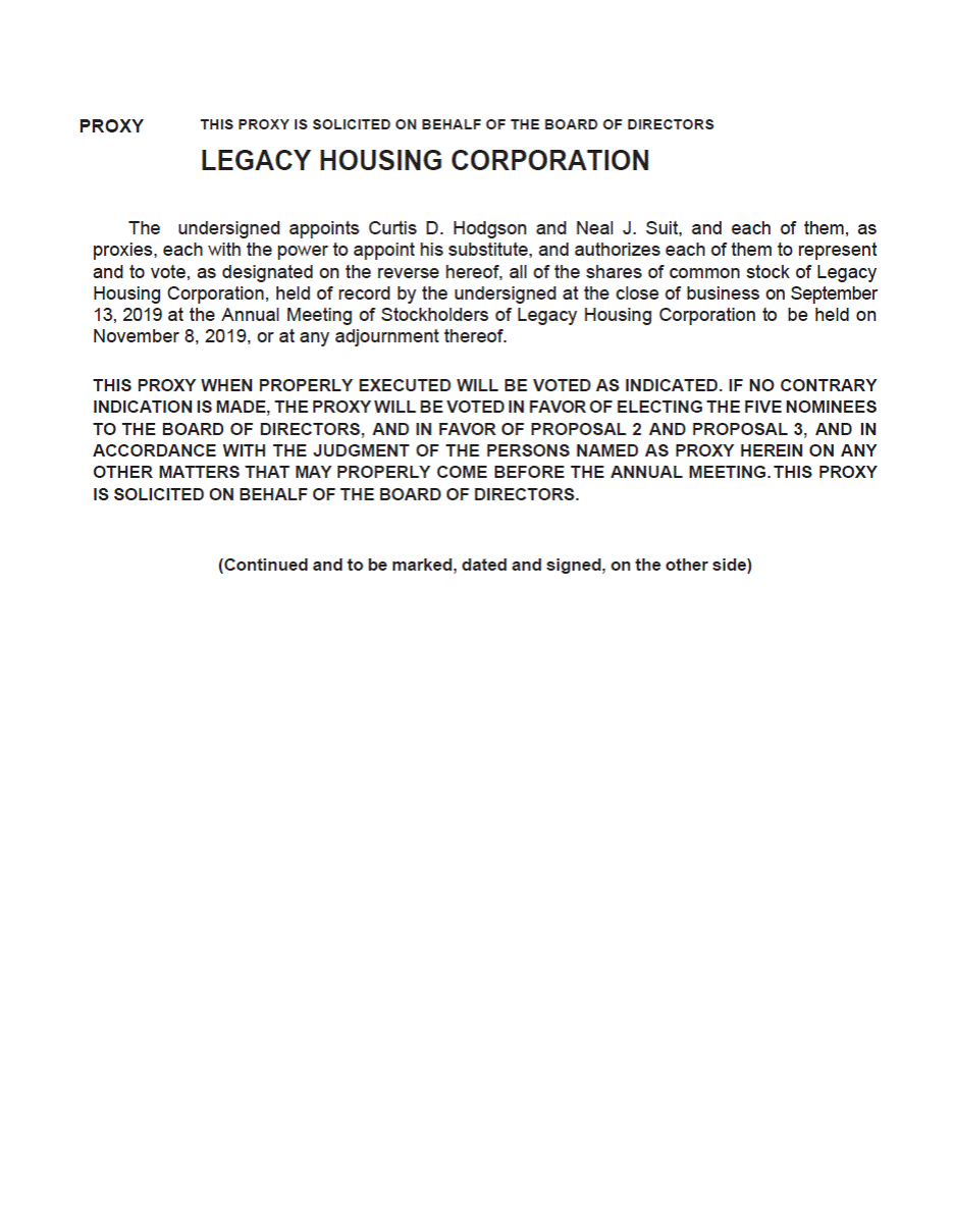 PROXY THIS PROXY IS SOLICITED ON BEHALF OF THE BOARD OF DIRECTORS LEGACY HOUSING CORPORATION Theundersigned appoints Curtis D. Hodgson and Neal J. Suit, and each of them, as proxies, each with the power to appoint his substitute, and authorizes each of them to represent and to vote, as designated on the reverse hereof, all of the shares of common stock of Legacy Housing Corporation, held of record by the undersigned at the close of business on September 13, 2019 at the Annual Meeting of Stockholders of Legacy Housing Corporation to be held on November 8, 2019, or at any adjournment thereof. THIS PROXY WHEN PROPERLY EXECUTED WILL BE VOTED AS INDICATED. IF NO CONTRARY INDICATION IS MADE, THE PROXY WILL BE VOTED IN FAVOR OF ELECTING THE FIVE NOMINEES TO THE BOARD OF DIRECTORS, AND IN FAVOR OF PROPOSAL 2 AND PROPOSAL 3, AND IN ACCORDANCE WITH THE JUDGMENT OF THE PERSONS NAMED AS PROXY HEREIN ON ANY OTHER MATTERS THAT MAY PROPERLY COME BEFORE THE ANNUAL MEETING. THIS PROXY IS SOLICITED ON BEHALF OF THE BOARD OF DIRECTORS. (Continued and to be marked, dated and signed, on the other side)