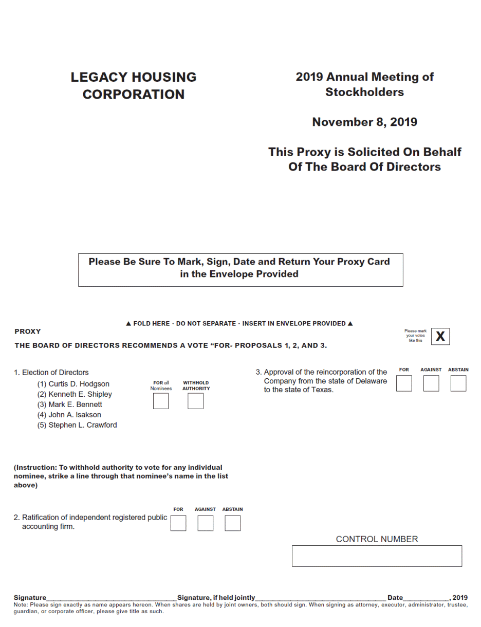YOUR VOTE IS IMPORTANT. PLEASE VOTE TODAY. LEGACY HOUSING CORPORATION MAIL – Mark, sign and date your proxy card and return it in the postage-paid envelope provided. FOLD HERE • DO NOT SEPARATE • INSERT IN ENVELOPE PROVIDED PROXY THE BOARD OF DIRECTORS RECOMMENDS A VOTE “FOR” PROPOSALS 1, 2, AND 3. X Please mark your votes like this 1. Election of Directors (1) Curtis D. Hodgson (2) Kenneth E. Shipley (3) Mark E. Bennett (4) John A. Isakson (5) Stephen L. Crawford FOR all Nominees WITHHOLD AUTHORITY (Instruction: To withhold authority to vote for any individual nominee, strike a line through that nominee’s name in the list above) 2. Ratification of independent registered public accounting firm. ABSTAIN FOR AGAINST FOR AGAINST ABSTAIN 3. Approval of the reincorporation of the Company from the state of Delaware to the state of Texas. CONTROL NUMBER Signature Signature, if held jointly Date , 2019 Note: Please sign exactly as name appears hereon. When shares are held by joint owners, both should sign. When signing as attorney, executor, administrator, trustee, guardian, or corporate officer, please give title as such.