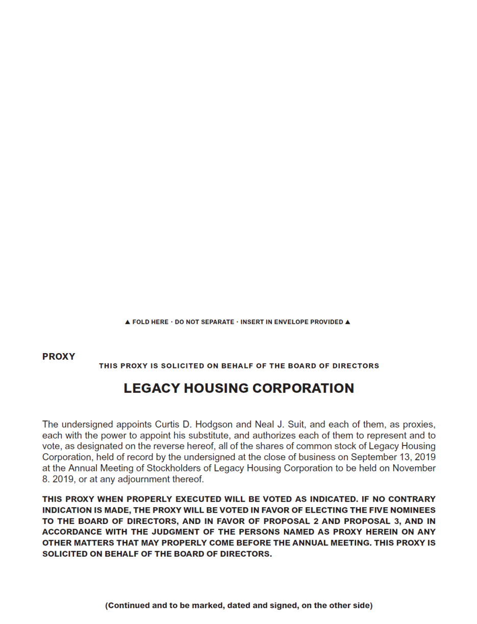 PROXY THIS PROXY IS SOLICITED ON BEHALF OF THE BOARD OF DIRECTORS LEGACY HOUSING CORPORATION Theundersigned appoints Curtis D. Hodgson and Neal J. Suit, and each of them, as proxies, each with the power to appoint his substitute, and authorizes each of them to represent and to vote, as designated on the reverse hereof, all of the shares of common stock of Legacy Housing Corporation, held of record by the undersigned at the close of business on September 13, 2019 at the Annual Meeting of Stockholders of Legacy Housing Corporation to be held on November 8, 2019, or at any adjournment thereof. THIS PROXY WHEN PROPERLY EXECUTED WILL BE VOTED AS INDICATED. IF NO CONTRARY INDICATION IS MADE, THE PROXY WILL BE VOTED IN FAVOR OF ELECTING THE FIVE NOMINEES TO THE BOARD OF DIRECTORS, AND IN FAVOR OF PROPOSAL 2 AND PROPOSAL 3, AND IN ACCORDANCE WITH THE JUDGMENT OF THE PERSONS NAMED AS PROXY HEREIN ON ANY OTHER MATTERS THAT MAY PROPERLY COME BEFORE THE ANNUAL MEETING. THIS PROXY IS SOLICITED ON BEHALF OF THE BOARD OF DIRECTORS. (Continued and to be marked, dated and signed, on the other side)