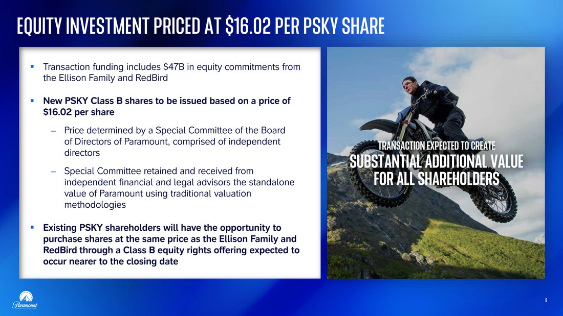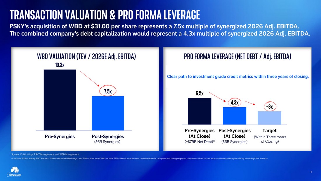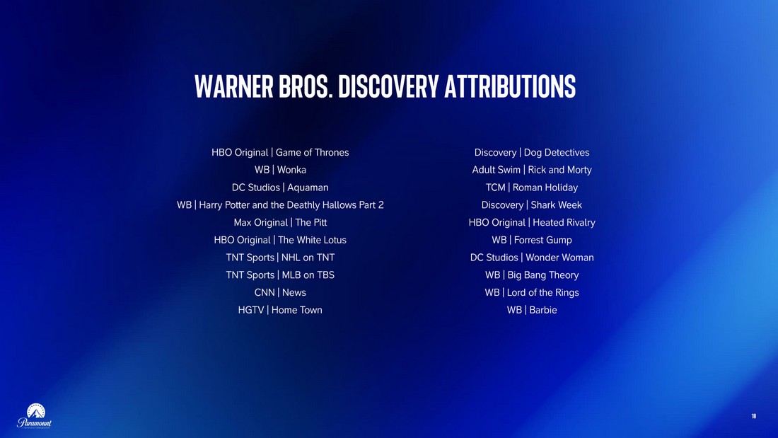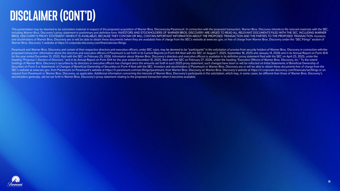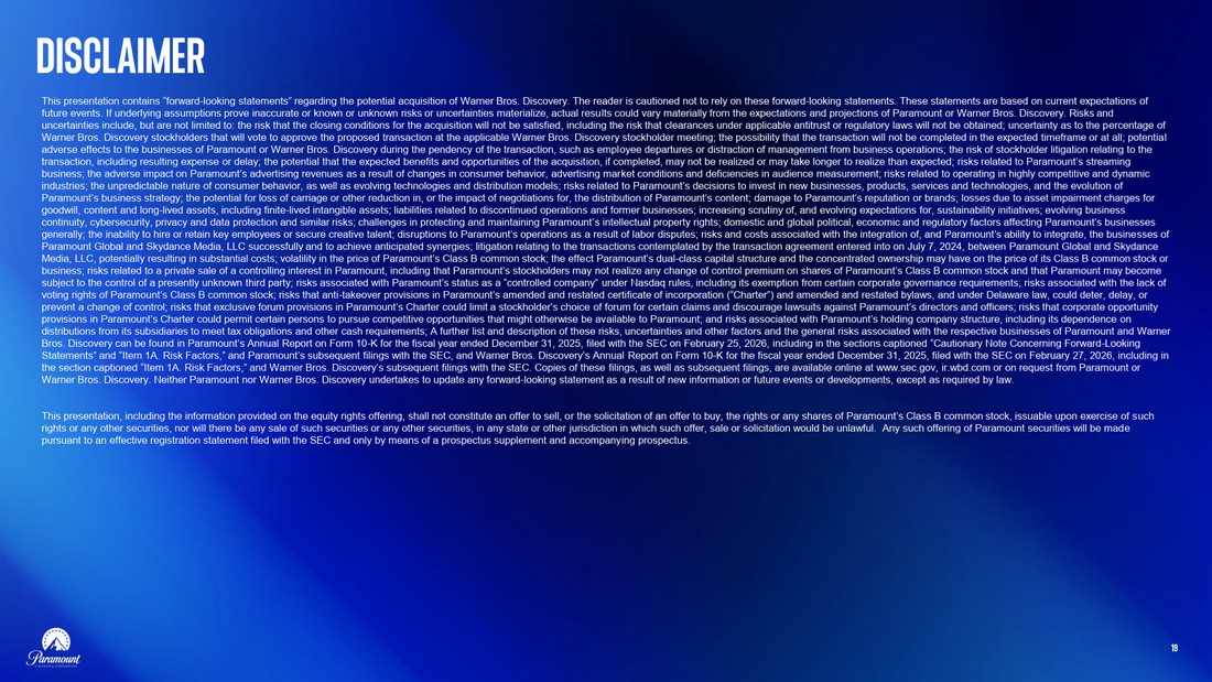 This communication contains “forward-looking statements” regarding the potential acquisition of WBD. The reader is cautioned not to rely on these forward-looking statements. These statements are based on current expectations of future events. If underlying assumptions prove inaccurate or known or unknown risks or uncertainties materialize, actual results could vary materially from the expectations and projections of Paramount or WBD. Risks and uncertainties include, but are not limited to: the risk that the closing conditions for the acquisition will not be satisfied, including the risk that clearances under applicable antitrust or regulatory laws will not be obtained; uncertainty as to the percentage of WBD stockholders that will vote to approve the proposed transaction at the applicable WBD stockholder meeting; the possibility that the transaction will not be completed in the expected timeframe or at all; potential adverse effects to the businesses of Paramount or WBD during the pendency of the transaction, such as employee departures or distraction of management from business operations; the risk of stockholder litigation relating to the transaction, including resulting expense or delay; the potential that the expected benefits and opportunities of the acquisition, if completed, may not be realized or may take longer to realize than expected; risks related to Paramount’s streaming business; the adverse impact on Paramount’s advertising revenues as a result of changes in consumer behavior, advertising market conditions and deficiencies in audience measurement; risks related to operating in highly competitive and dynamic industries; the unpredictable nature of consumer behavior, as well as evolving technologies and distribution models; risks related to Paramount’s decisions to invest in new businesses, products, services and technologies, and the evolution of Paramount’s business strategy; the potential for loss of carriage or other reduction in, or the impact of negotiations for, the distribution of Paramount’s content; damage to Paramount’s reputation or brands; losses due to asset impairment charges for goodwill, content and long-lived assets, including finite-lived intangible assets; liabilities related to discontinued operations and former businesses; increasing scrutiny of, and evolving expectations for, sustainability initiatives; evolving business continuity, cybersecurity, privacy and data protection and similar risks; challenges in protecting and maintaining Paramount’s intellectual property rights; domestic and global political, economic and regulatory factors affecting Paramount’s businesses generally; the inability to hire or retain key employees or secure creative talent; disruptions to Paramount’s operations as a result of labor disputes; risks and costs associated with the integration of, and Paramount’s ability to integrate, the businesses of Paramount Global and Skydance Media, LLC successfully and to achieve anticipated synergies; litigation relating to the transactions contemplated by the transaction agreement entered into on July 7, 2024, between Paramount Global and Skydance Media, LLC, potentially resulting in substantial costs; volatility in the price of Paramount’s Class B common stock; the effect Paramount’s dual-class capital structure and the concentrated ownership may have on the price of its Class B common stock or business; risks related to a private sale of a controlling interest in Paramount, including that Paramount’s stockholders may not realize any change of control premium on shares of Paramount’s Class B common stock and that Paramount may become subject to the control of a presently unknown third party; risks associated with Paramount’s status as a “controlled company” under Nasdaq rules, including its exemption from certain corporate governance requirements; risks associated with the lack of voting rights of Paramount’s Class B common stock; risks that anti-takeover provisions in Paramount’s amended and restated certificate of incorporation (“Charter”) and amended and restated bylaws, and under Delaware law, could deter, delay, or prevent a change of control; risks that exclusive forum provisions in Paramount’s Charter could limit a stockholder’s choice of forum for certain claims and discourage lawsuits against Paramount’s directors and officers; risks that corporate opportunity provisions in Paramount’s Charter could permit certain persons to pursue competitive opportunities that might otherwise be available to Paramount; and risks associated with Paramount’s holding company structure, including its dependence on distributions from its subsidiaries to meet tax obligations and other cash requirements; A further list and description of these risks, uncertainties and other factors and the general risks associated with the respective businesses of Paramount and WBD can be found in Paramount’s Annual Report on Form 10-K for the fiscal year ended December 31, 2025, filed with the SEC on February 25, 2026, including in the sections captioned “Cautionary Note Concerning Forward-Looking Statements” and “Item 1A. Risk Factors,” and Paramount’s subsequent filings with the SEC, and WBD’s Annual Report on Form 10-K for the fiscal year ended December 31, 2025, filed with the SEC on February 27, 2026, including in the section captioned “Item 1A. Risk Factors,” and WBD’s subsequent filings with the SEC. Copies of these filings, as well as subsequent filings, are available online at www.sec.gov, ir.wbd.com or on request from Paramount or WBD. Neither Paramount nor WBD undertakes to update any forward-looking statement as a result of new information or future events or developments, except as required by law.