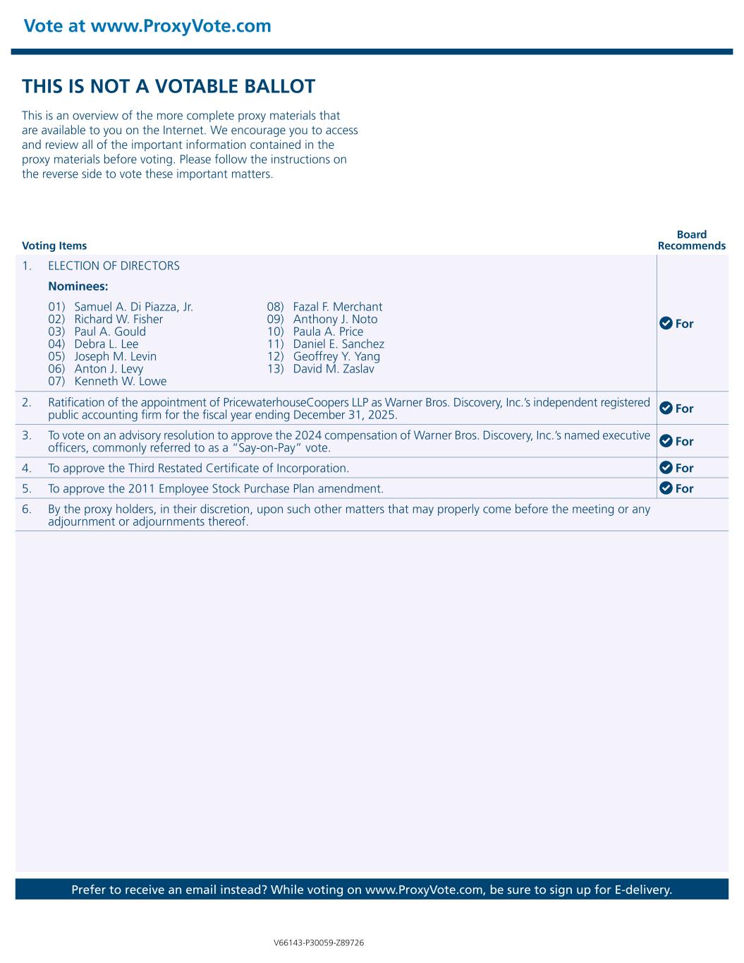 Prefer to receive an email instead? While voting on www.ProxyVote.com, be sure to sign up for E-delivery. Voting Items Board Recommends V66143-P30059-Z89726 THIS IS NOT A VOTABLE BALLOT This is an overview of the more complete proxy materials that are available to you on the Internet. We encourage you to access and review all of the important information contained in the proxy materials before voting. Please follow the instructions on the reverse side to vote these important matters. Vote at www.ProxyVote.com 1. ELECTION OF DIRECTORS For Nominees: 01) Samuel A. Di Piazza, Jr. 02) Richard W. Fisher 03) Paul A. Gould 04) Debra L. Lee 05) Joseph M. Levin 06) Anton J. Levy 07) Kenneth W. Lowe 08) Fazal F. Merchant 09) Anthony J. Noto 10) Paula A. Price 11) Daniel E. Sanchez 12) Geoffrey Y. Yang 13) David M. Zaslav 2. Ratification of the appointment of PricewaterhouseCoopers LLP as Warner Bros. Discovery, Inc.’s independent registered public accounting firm for the fiscal year ending December 31, 2025. For 3. To vote on an advisory resolution to approve the 2024 compensation of Warner Bros. Discovery, Inc.’s named executive officers, commonly referred to as a “Say-on-Pay” vote. For 4. To approve the Third Restated Certificate of Incorporation. For 5. To approve the 2011 Employee Stock Purchase Plan amendment. For 6. By the proxy holders, in their discretion, upon such other matters that may properly come before the meeting or any adjournment or adjournments thereof.