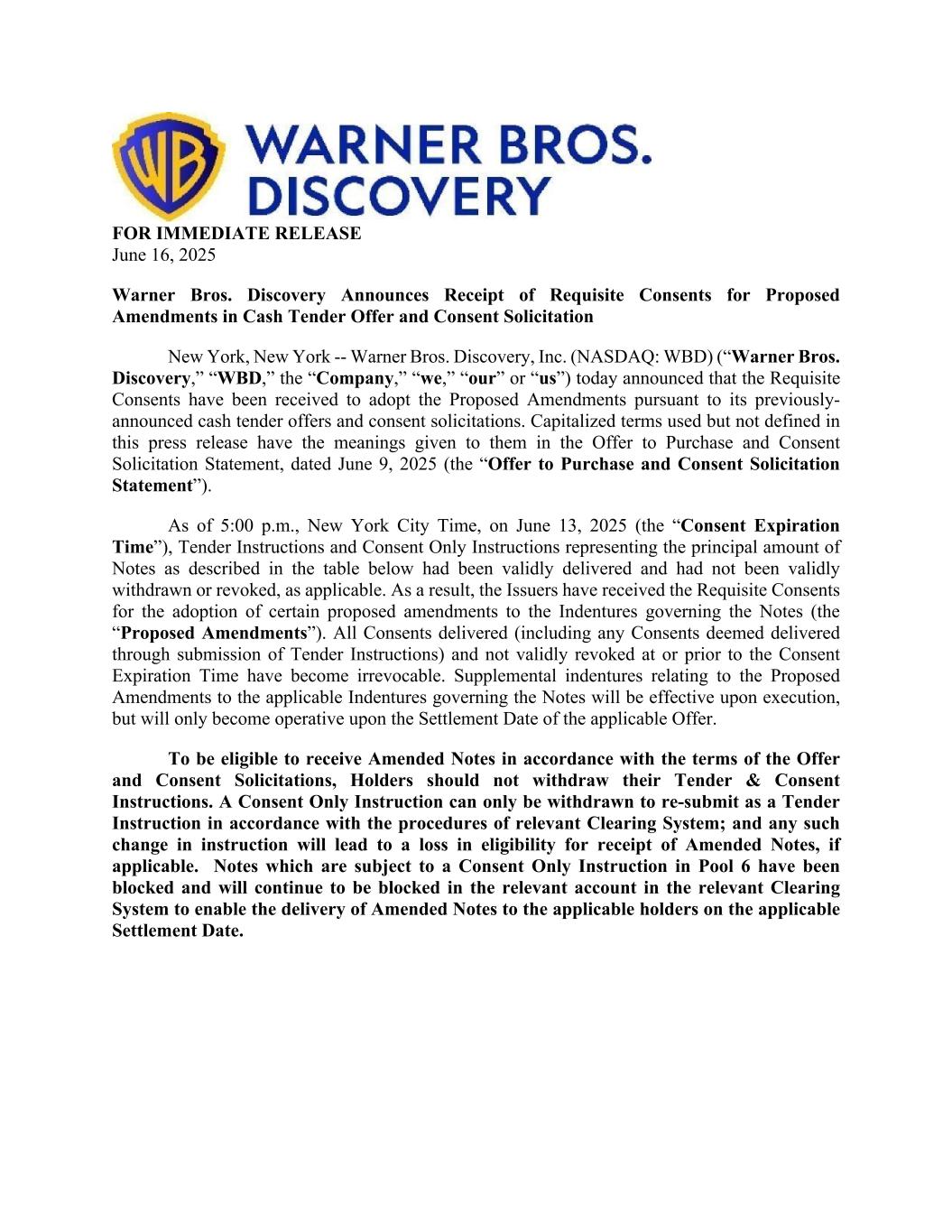 FOR IMMEDIATE RELEASE June 16, 2025 Warner Bros. Discovery Announces Receipt of Requisite Consents for Proposed Amendments in Cash Tender Offer and Consent Solicitation New York, New York -- Warner Bros. Discovery, Inc. (NASDAQ: WBD) (“Warner Bros. Discovery,” “WBD,” the “Company,” “we,” “our” or “us”) today announced that the Requisite Consents have been received to adopt the Proposed Amendments pursuant to its previously- announced cash tender offers and consent solicitations. Capitalized terms used but not defined in this press release have the meanings given to them in the Offer to Purchase and Consent Solicitation Statement, dated June 9, 2025 (the “Offer to Purchase and Consent Solicitation Statement”). As of 5:00 p.m., New York City Time, on June 13, 2025 (the “Consent Expiration Time”), Tender Instructions and Consent Only Instructions representing the principal amount of Notes as described in the table below had been validly delivered and had not been validly withdrawn or revoked, as applicable. As a result, the Issuers have received the Requisite Consents for the adoption of certain proposed amendments to the Indentures governing the Notes (the “Proposed Amendments”). All Consents delivered (including any Consents deemed delivered through submission of Tender Instructions) and not validly revoked at or prior to the Consent Expiration Time have become irrevocable. Supplemental indentures relating to the Proposed Amendments to the applicable Indentures governing the Notes will be effective upon execution, but will only become operative upon the Settlement Date of the applicable Offer. To be eligible to receive Amended Notes in accordance with the terms of the Offer and Consent Solicitations, Holders should not withdraw their Tender & Consent Instructions. A Consent Only Instruction can only be withdrawn to re-submit as a Tender Instruction in accordance with the procedures of relevant Clearing System; and any such change in instruction will lead to a loss in eligibility for receipt of Amended Notes, if applicable. Notes which are subject to a Consent Only Instruction in Pool 6 have been blocked and will continue to be blocked in the relevant account in the relevant Clearing System to enable the delivery of Amended Notes to the applicable holders on the applicable Settlement Date.