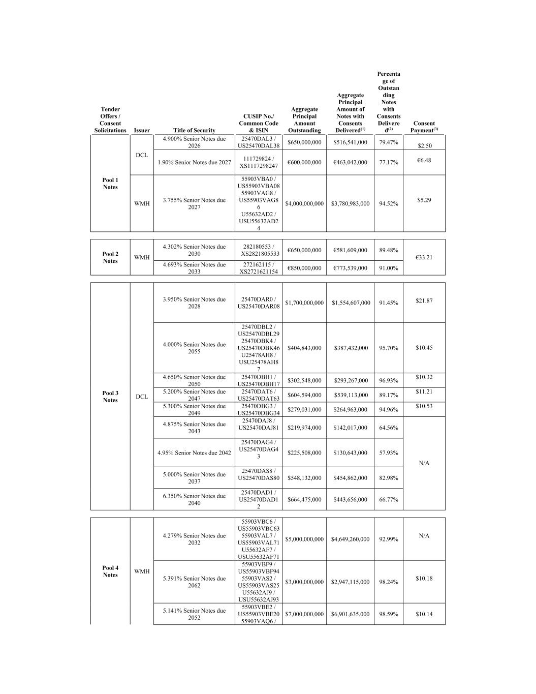 Tender Offers / Consent Solicitations Issuer Title of Security CUSIP No./ Common Code & ISIN Aggregate Principal Amount Outstanding Aggregate Principal Amount of Notes with Consents Delivered(1) Percenta ge of Outstan ding Notes with Consents Delivere d(2) Consent Payment(3) Pool 1 Notes DCL 4.900% Senior Notes due 2026 25470DAL3 / US25470DAL38 $650,000,000 $516,541,000 79.47% $2.50 1.90% Senior Notes due 2027 111729824 / XS1117298247 €600,000,000 €463,042,000 77.17% €6.48 WMH 3.755% Senior Notes due 2027 55903VBA0 / US55903VBA08 55903VAG8 / US55903VAG8 6 U55632AD2 / USU55632AD2 4 $4,000,000,000 $3,780,983,000 94.52% $5.29 Pool 2 Notes WMH 4.302% Senior Notes due 2030 282180553 / XS2821805533 €650,000,000 €581,609,000 89.48% €33.21 4.693% Senior Notes due 2033 272162115 / XS2721621154 €850,000,000 €773,539,000 91.00% Pool 3 Notes DCL 3.950% Senior Notes due 2028 25470DAR0 / US25470DAR08 $1,700,000,000 $1,554,607,000 91.45% $21.87 4.000% Senior Notes due 2055 25470DBL2 / US25470DBL29 25470DBK4 / US25470DBK46 U25478AH8 / USU25478AH8 7 $404,843,000 $387,432,000 95.70% $10.45 4.650% Senior Notes due 2050 25470DBH1 / US25470DBH17 $302,548,000 $293,267,000 96.93% $10.32 5.200% Senior Notes due 2047 25470DAT6 / US25470DAT63 $604,594,000 $539,113,000 89.17% $11.21 5.300% Senior Notes due 2049 25470DBG3 / US25470DBG34 $279,031,000 $264,963,000 94.96% $10.53 4.875% Senior Notes due 2043 25470DAJ8 / US25470DAJ81 $219,974,000 $142,017,000 64.56% N/A 4.95% Senior Notes due 2042 25470DAG4 / US25470DAG4 3 $225,508,000 $130,643,000 57.93% 5.000% Senior Notes due 2037 25470DAS8 / US25470DAS80 $548,132,000 $454,862,000 82.98% 6.350% Senior Notes due 2040 25470DAD1 / US25470DAD1 2 $664,475,000 $443,656,000 66.77% Pool 4 Notes WMH 4.279% Senior Notes due 2032 55903VBC6 / US55903VBC63 55903VAL7 / US55903VAL71 U55632AF7 / USU55632AF71 $5,000,000,000 $4,649,260,000 92.99% N/A 5.391% Senior Notes due 2062 55903VBF9 / US55903VBF94 55903VAS2 / US55903VAS25 U55632AJ9 / USU55632AJ93 $3,000,000,000 $2,947,115,000 98.24% $10.18 5.141% Senior Notes due 2052 55903VBE2 / US55903VBE20 55903VAQ6 / $7,000,000,000 $6,901,635,000 98.59% $10.14