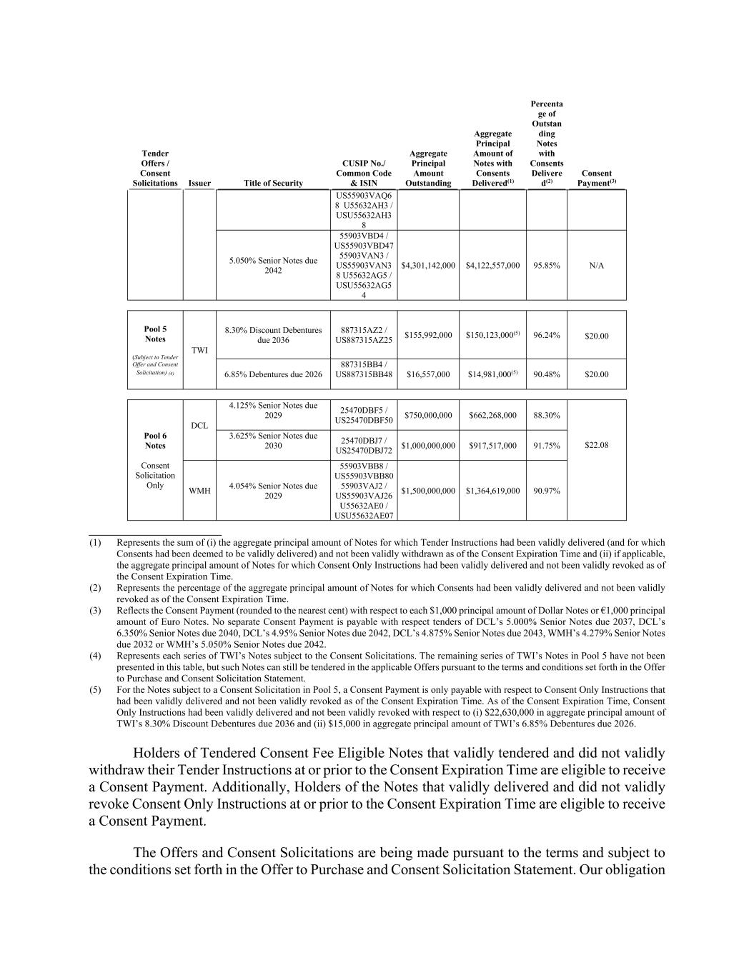 Tender Offers / Consent Solicitations Issuer Title of Security CUSIP No./ Common Code & ISIN Aggregate Principal Amount Outstanding Aggregate Principal Amount of Notes with Consents Delivered(1) Percenta ge of Outstan ding Notes with Consents Delivere d(2) Consent Payment(3) US55903VAQ6 8 U55632AH3 / USU55632AH3 8 5.050% Senior Notes due 2042 55903VBD4 / US55903VBD47 55903VAN3 / US55903VAN3 8 U55632AG5 / USU55632AG5 4 $4,301,142,000 $4,122,557,000 95.85% N/A Pool 5 Notes (Subject to Tender Offer and Consent Solicitation) (4) TWI 8.30% Discount Debentures due 2036 887315AZ2 / US887315AZ25 $155,992,000 $150,123,000(5) 96.24% $20.00 6.85% Debentures due 2026 887315BB4 / US887315BB48 $16,557,000 $14,981,000(5) 90.48% $20.00 Pool 6 Notes Consent Solicitation Only DCL 4.125% Senior Notes due 2029 25470DBF5 / US25470DBF50 $750,000,000 $662,268,000 88.30% $22.08 3.625% Senior Notes due 2030 25470DBJ7 / US25470DBJ72 $1,000,000,000 $917,517,000 91.75% WMH 4.054% Senior Notes due 2029 55903VBB8 / US55903VBB80 55903VAJ2 / US55903VAJ26 U55632AE0 / USU55632AE07 $1,500,000,000 $1,364,619,000 90.97% (1) Represents the sum of (i) the aggregate principal amount of Notes for which Tender Instructions had been validly delivered (and for which Consents had been deemed to be validly delivered) and not been validly withdrawn as of the Consent Expiration Time and (ii) if applicable, the aggregate principal amount of Notes for which Consent Only Instructions had been validly delivered and not been validly revoked as of the Consent Expiration Time. (2) Represents the percentage of the aggregate principal amount of Notes for which Consents had been validly delivered and not been validly revoked as of the Consent Expiration Time. (3) Reflects the Consent Payment (rounded to the nearest cent) with respect to each $1,000 principal amount of Dollar Notes or €1,000 principal amount of Euro Notes. No separate Consent Payment is payable with respect tenders of DCL’s 5.000% Senior Notes due 2037, DCL’s 6.350% Senior Notes due 2040, DCL’s 4.95% Senior Notes due 2042, DCL’s 4.875% Senior Notes due 2043, WMH’s 4.279% Senior Notes due 2032 or WMH’s 5.050% Senior Notes due 2042. (4) Represents each series of TWI’s Notes subject to the Consent Solicitations. The remaining series of TWI’s Notes in Pool 5 have not been presented in this table, but such Notes can still be tendered in the applicable Offers pursuant to the terms and conditions set forth in the Offer to Purchase and Consent Solicitation Statement. (5) For the Notes subject to a Consent Solicitation in Pool 5, a Consent Payment is only payable with respect to Consent Only Instructions that had been validly delivered and not been validly revoked as of the Consent Expiration Time. As of the Consent Expiration Time, Consent Only Instructions had been validly delivered and not been validly revoked with respect to (i) $22,630,000 in aggregate principal amount of TWI’s 8.30% Discount Debentures due 2036 and (ii) $15,000 in aggregate principal amount of TWI’s 6.85% Debentures due 2026. Holders of Tendered Consent Fee Eligible Notes that validly tendered and did not validly withdraw their Tender Instructions at or prior to the Consent Expiration Time are eligible to receive a Consent Payment. Additionally, Holders of the Notes that validly delivered and did not validly revoke Consent Only Instructions at or prior to the Consent Expiration Time are eligible to receive a Consent Payment. The Offers and Consent Solicitations are being made pursuant to the terms and subject to the conditions set forth in the Offer to Purchase and Consent Solicitation Statement. Our obligation