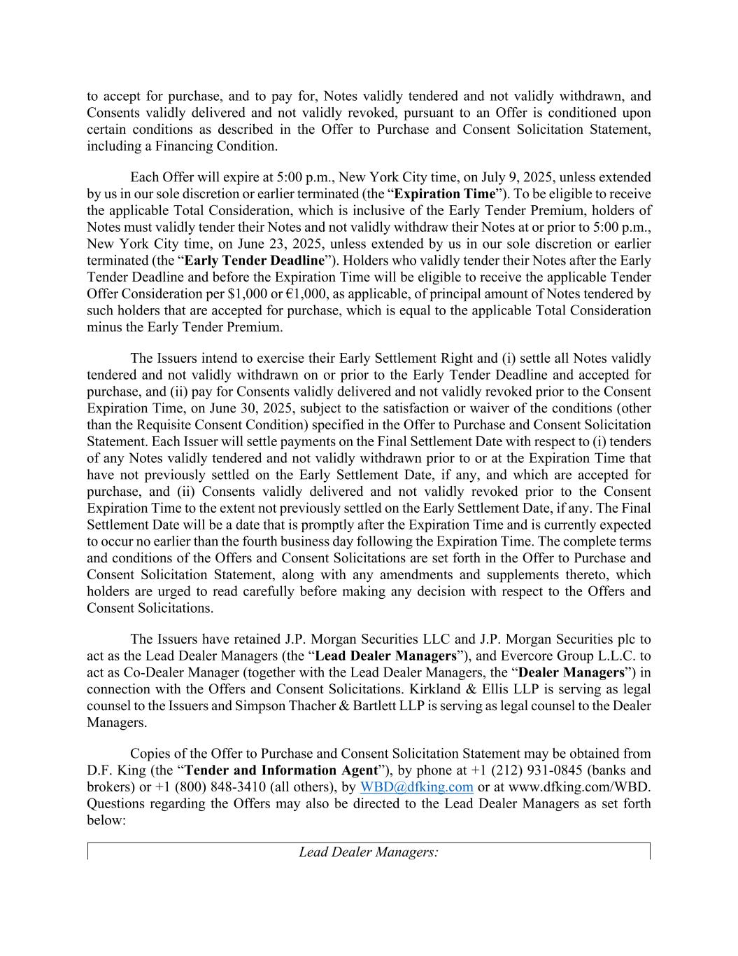 to accept for purchase, and to pay for, Notes validly tendered and not validly withdrawn, and Consents validly delivered and not validly revoked, pursuant to an Offer is conditioned upon certain conditions as described in the Offer to Purchase and Consent Solicitation Statement, including a Financing Condition. Each Offer will expire at 5:00 p.m., New York City time, on July 9, 2025, unless extended by us in our sole discretion or earlier terminated (the “Expiration Time”). To be eligible to receive the applicable Total Consideration, which is inclusive of the Early Tender Premium, holders of Notes must validly tender their Notes and not validly withdraw their Notes at or prior to 5:00 p.m., New York City time, on June 23, 2025, unless extended by us in our sole discretion or earlier terminated (the “Early Tender Deadline”). Holders who validly tender their Notes after the Early Tender Deadline and before the Expiration Time will be eligible to receive the applicable Tender Offer Consideration per $1,000 or €1,000, as applicable, of principal amount of Notes tendered by such holders that are accepted for purchase, which is equal to the applicable Total Consideration minus the Early Tender Premium. The Issuers intend to exercise their Early Settlement Right and (i) settle all Notes validly tendered and not validly withdrawn on or prior to the Early Tender Deadline and accepted for purchase, and (ii) pay for Consents validly delivered and not validly revoked prior to the Consent Expiration Time, on June 30, 2025, subject to the satisfaction or waiver of the conditions (other than the Requisite Consent Condition) specified in the Offer to Purchase and Consent Solicitation Statement. Each Issuer will settle payments on the Final Settlement Date with respect to (i) tenders of any Notes validly tendered and not validly withdrawn prior to or at the Expiration Time that have not previously settled on the Early Settlement Date, if any, and which are accepted for purchase, and (ii) Consents validly delivered and not validly revoked prior to the Consent Expiration Time to the extent not previously settled on the Early Settlement Date, if any. The Final Settlement Date will be a date that is promptly after the Expiration Time and is currently expected to occur no earlier than the fourth business day following the Expiration Time. The complete terms and conditions of the Offers and Consent Solicitations are set forth in the Offer to Purchase and Consent Solicitation Statement, along with any amendments and supplements thereto, which holders are urged to read carefully before making any decision with respect to the Offers and Consent Solicitations. The Issuers have retained J.P. Morgan Securities LLC and J.P. Morgan Securities plc to act as the Lead Dealer Managers (the “Lead Dealer Managers”), and Evercore Group L.L.C. to act as Co-Dealer Manager (together with the Lead Dealer Managers, the “Dealer Managers”) in connection with the Offers and Consent Solicitations. Kirkland & Ellis LLP is serving as legal counsel to the Issuers and Simpson Thacher & Bartlett LLP is serving as legal counsel to the Dealer Managers. Copies of the Offer to Purchase and Consent Solicitation Statement may be obtained from D.F. King (the “Tender and Information Agent”), by phone at +1 (212) 931-0845 (banks and brokers) or +1 (800) 848-3410 (all others), by WBD@dfking.com or at www.dfking.com/WBD. Questions regarding the Offers may also be directed to the Lead Dealer Managers as set forth below: Lead Dealer Managers: