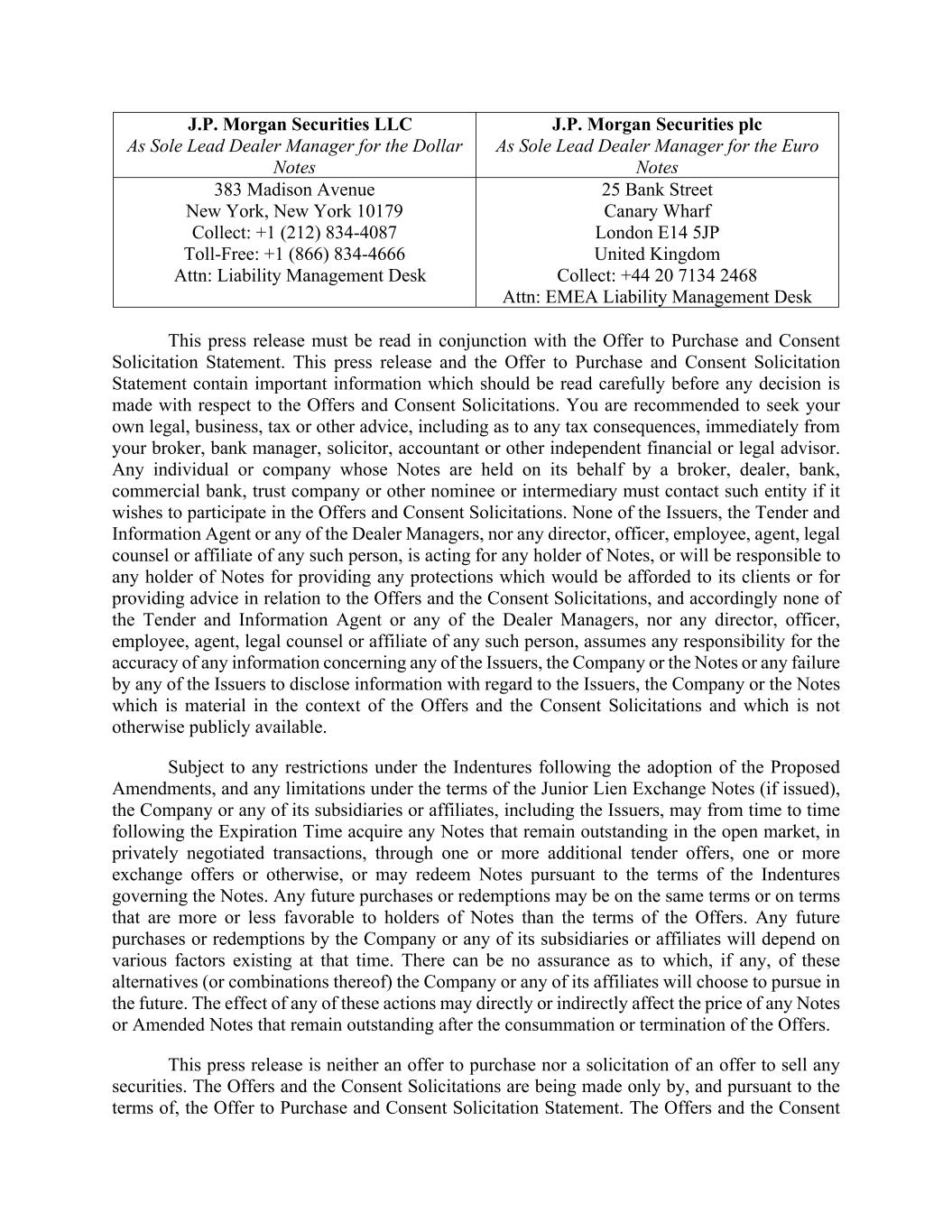J.P. Morgan Securities LLC As Sole Lead Dealer Manager for the Dollar Notes J.P. Morgan Securities plc As Sole Lead Dealer Manager for the Euro Notes 383 Madison Avenue New York, New York 10179 Collect: +1 (212) 834-4087 Toll-Free: +1 (866) 834-4666 Attn: Liability Management Desk 25 Bank Street Canary Wharf London E14 5JP United Kingdom Collect: +44 20 7134 2468 Attn: EMEA Liability Management Desk This press release must be read in conjunction with the Offer to Purchase and Consent Solicitation Statement. This press release and the Offer to Purchase and Consent Solicitation Statement contain important information which should be read carefully before any decision is made with respect to the Offers and Consent Solicitations. You are recommended to seek your own legal, business, tax or other advice, including as to any tax consequences, immediately from your broker, bank manager, solicitor, accountant or other independent financial or legal advisor. Any individual or company whose Notes are held on its behalf by a broker, dealer, bank, commercial bank, trust company or other nominee or intermediary must contact such entity if it wishes to participate in the Offers and Consent Solicitations. None of the Issuers, the Tender and Information Agent or any of the Dealer Managers, nor any director, officer, employee, agent, legal counsel or affiliate of any such person, is acting for any holder of Notes, or will be responsible to any holder of Notes for providing any protections which would be afforded to its clients or for providing advice in relation to the Offers and the Consent Solicitations, and accordingly none of the Tender and Information Agent or any of the Dealer Managers, nor any director, officer, employee, agent, legal counsel or affiliate of any such person, assumes any responsibility for the accuracy of any information concerning any of the Issuers, the Company or the Notes or any failure by any of the Issuers to disclose information with regard to the Issuers, the Company or the Notes which is material in the context of the Offers and the Consent Solicitations and which is not otherwise publicly available. Subject to any restrictions under the Indentures following the adoption of the Proposed Amendments, and any limitations under the terms of the Junior Lien Exchange Notes (if issued), the Company or any of its subsidiaries or affiliates, including the Issuers, may from time to time following the Expiration Time acquire any Notes that remain outstanding in the open market, in privately negotiated transactions, through one or more additional tender offers, one or more exchange offers or otherwise, or may redeem Notes pursuant to the terms of the Indentures governing the Notes. Any future purchases or redemptions may be on the same terms or on terms that are more or less favorable to holders of Notes than the terms of the Offers. Any future purchases or redemptions by the Company or any of its subsidiaries or affiliates will depend on various factors existing at that time. There can be no assurance as to which, if any, of these alternatives (or combinations thereof) the Company or any of its affiliates will choose to pursue in the future. The effect of any of these actions may directly or indirectly affect the price of any Notes or Amended Notes that remain outstanding after the consummation or termination of the Offers. This press release is neither an offer to purchase nor a solicitation of an offer to sell any securities. The Offers and the Consent Solicitations are being made only by, and pursuant to the terms of, the Offer to Purchase and Consent Solicitation Statement. The Offers and the Consent