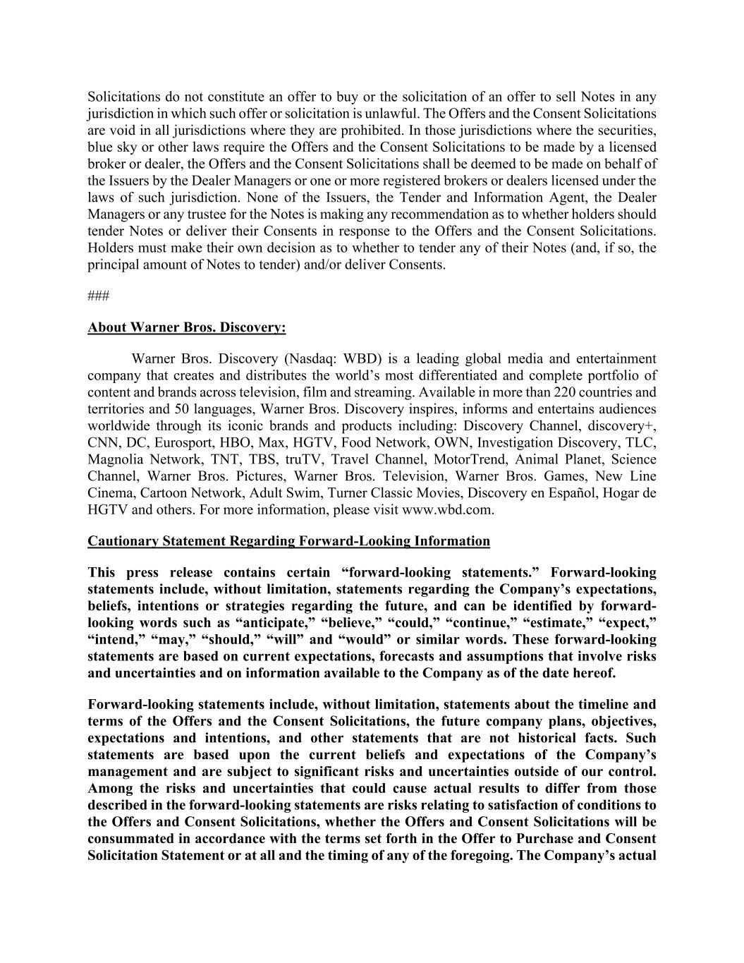 Solicitations do not constitute an offer to buy or the solicitation of an offer to sell Notes in any jurisdiction in which such offer or solicitation is unlawful. The Offers and the Consent Solicitations are void in all jurisdictions where they are prohibited. In those jurisdictions where the securities, blue sky or other laws require the Offers and the Consent Solicitations to be made by a licensed broker or dealer, the Offers and the Consent Solicitations shall be deemed to be made on behalf of the Issuers by the Dealer Managers or one or more registered brokers or dealers licensed under the laws of such jurisdiction. None of the Issuers, the Tender and Information Agent, the Dealer Managers or any trustee for the Notes is making any recommendation as to whether holders should tender Notes or deliver their Consents in response to the Offers and the Consent Solicitations. Holders must make their own decision as to whether to tender any of their Notes (and, if so, the principal amount of Notes to tender) and/or deliver Consents. ### About Warner Bros. Discovery: Warner Bros. Discovery (Nasdaq: WBD) is a leading global media and entertainment company that creates and distributes the world’s most differentiated and complete portfolio of content and brands across television, film and streaming. Available in more than 220 countries and territories and 50 languages, Warner Bros. Discovery inspires, informs and entertains audiences worldwide through its iconic brands and products including: Discovery Channel, discovery+, CNN, DC, Eurosport, HBO, Max, HGTV, Food Network, OWN, Investigation Discovery, TLC, Magnolia Network, TNT, TBS, truTV, Travel Channel, MotorTrend, Animal Planet, Science Channel, Warner Bros. Pictures, Warner Bros. Television, Warner Bros. Games, New Line Cinema, Cartoon Network, Adult Swim, Turner Classic Movies, Discovery en Español, Hogar de HGTV and others. For more information, please visit www.wbd.com. Cautionary Statement Regarding Forward-Looking Information This press release contains certain “forward-looking statements.” Forward-looking statements include, without limitation, statements regarding the Company’s expectations, beliefs, intentions or strategies regarding the future, and can be identified by forward- looking words such as “anticipate,” “believe,” “could,” “continue,” “estimate,” “expect,” “intend,” “may,” “should,” “will” and “would” or similar words. These forward-looking statements are based on current expectations, forecasts and assumptions that involve risks and uncertainties and on information available to the Company as of the date hereof. Forward-looking statements include, without limitation, statements about the timeline and terms of the Offers and the Consent Solicitations, the future company plans, objectives, expectations and intentions, and other statements that are not historical facts. Such statements are based upon the current beliefs and expectations of the Company’s management and are subject to significant risks and uncertainties outside of our control. Among the risks and uncertainties that could cause actual results to differ from those described in the forward-looking statements are risks relating to satisfaction of conditions to the Offers and Consent Solicitations, whether the Offers and Consent Solicitations will be consummated in accordance with the terms set forth in the Offer to Purchase and Consent Solicitation Statement or at all and the timing of any of the foregoing. The Company’s actual