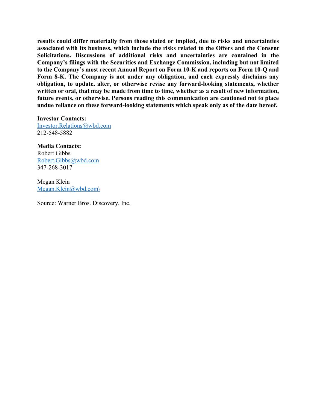 results could differ materially from those stated or implied, due to risks and uncertainties associated with its business, which include the risks related to the Offers and the Consent Solicitations. Discussions of additional risks and uncertainties are contained in the Company’s filings with the Securities and Exchange Commission, including but not limited to the Company’s most recent Annual Report on Form 10-K and reports on Form 10-Q and Form 8-K. The Company is not under any obligation, and each expressly disclaims any obligation, to update, alter, or otherwise revise any forward-looking statements, whether written or oral, that may be made from time to time, whether as a result of new information, future events, or otherwise. Persons reading this communication are cautioned not to place undue reliance on these forward-looking statements which speak only as of the date hereof. Investor Contacts: Investor.Relations@wbd.com 212-548-5882 Media Contacts: Robert Gibbs Robert.Gibbs@wbd.com 347-268-3017 Megan Klein Megan.Klein@wbd.com\ Source: Warner Bros. Discovery, Inc.