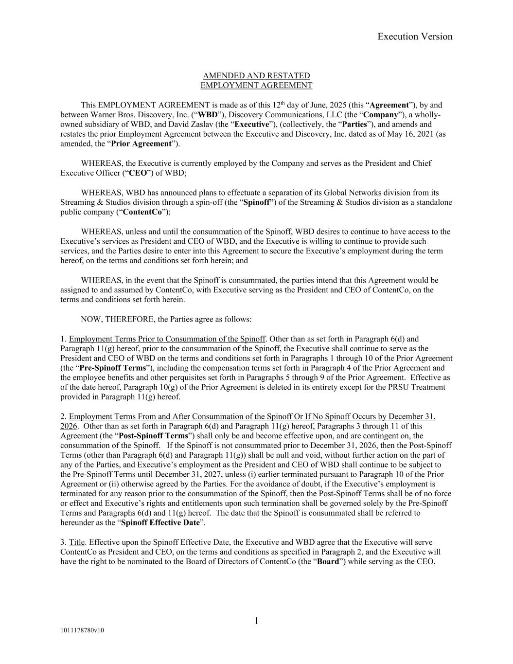 Execution Version 1 1011178780v10 AMENDED AND RESTATED EMPLOYMENT AGREEMENT This EMPLOYMENT AGREEMENT is made as of this 12th day of June, 2025 (this “Agreement”), by and between Warner Bros. Discovery, Inc. (“WBD”), Discovery Communications, LLC (the “Company”), a wholly- owned subsidiary of WBD, and David Zaslav (the “Executive”), (collectively, the “Parties”), and amends and restates the prior Employment Agreement between the Executive and Discovery, Inc. dated as of May 16, 2021 (as amended, the “Prior Agreement”). WHEREAS, the Executive is currently employed by the Company and serves as the President and Chief Executive Officer (“CEO”) of WBD; WHEREAS, WBD has announced plans to effectuate a separation of its Global Networks division from its Streaming & Studios division through a spin-off (the “Spinoff”) of the Streaming & Studios division as a standalone public company (“ContentCo”); WHEREAS, unless and until the consummation of the Spinoff, WBD desires to continue to have access to the Executive’s services as President and CEO of WBD, and the Executive is willing to continue to provide such services, and the Parties desire to enter into this Agreement to secure the Executive’s employment during the term hereof, on the terms and conditions set forth herein; and WHEREAS, in the event that the Spinoff is consummated, the parties intend that this Agreement would be assigned to and assumed by ContentCo, with Executive serving as the President and CEO of ContentCo, on the terms and conditions set forth herein. NOW, THEREFORE, the Parties agree as follows: 1. Employment Terms Prior to Consummation of the Spinoff. Other than as set forth in Paragraph 6(d) and Paragraph 11(g) hereof, prior to the consummation of the Spinoff, the Executive shall continue to serve as the President and CEO of WBD on the terms and conditions set forth in Paragraphs 1 through 10 of the Prior Agreement (the “Pre-Spinoff Terms”), including the compensation terms set forth in Paragraph 4 of the Prior Agreement and the employee benefits and other perquisites set forth in Paragraphs 5 through 9 of the Prior Agreement. Effective as of the date hereof, Paragraph 10(g) of the Prior Agreement is deleted in its entirety except for the PRSU Treatment provided in Paragraph 11(g) hereof. 2. Employment Terms From and After Consummation of the Spinoff Or If No Spinoff Occurs by December 31, 2026. Other than as set forth in Paragraph 6(d) and Paragraph 11(g) hereof, Paragraphs 3 through 11 of this Agreement (the “Post-Spinoff Terms”) shall only be and become effective upon, and are contingent on, the consummation of the Spinoff. If the Spinoff is not consummated prior to December 31, 2026, then the Post-Spinoff Terms (other than Paragraph 6(d) and Paragraph 11(g)) shall be null and void, without further action on the part of any of the Parties, and Executive’s employment as the President and CEO of WBD shall continue to be subject to the Pre-Spinoff Terms until December 31, 2027, unless (i) earlier terminated pursuant to Paragraph 10 of the Prior Agreement or (ii) otherwise agreed by the Parties. For the avoidance of doubt, if the Executive’s employment is terminated for any reason prior to the consummation of the Spinoff, then the Post-Spinoff Terms shall be of no force or effect and Executive’s rights and entitlements upon such termination shall be governed solely by the Pre-Spinoff Terms and Paragraphs 6(d) and 11(g) hereof. The date that the Spinoff is consummated shall be referred to hereunder as the “Spinoff Effective Date”. 3. Title. Effective upon the Spinoff Effective Date, the Executive and WBD agree that the Executive will serve ContentCo as President and CEO, on the terms and conditions as specified in Paragraph 2, and the Executive will have the right to be nominated to the Board of Directors of ContentCo (the “Board”) while serving as the CEO,