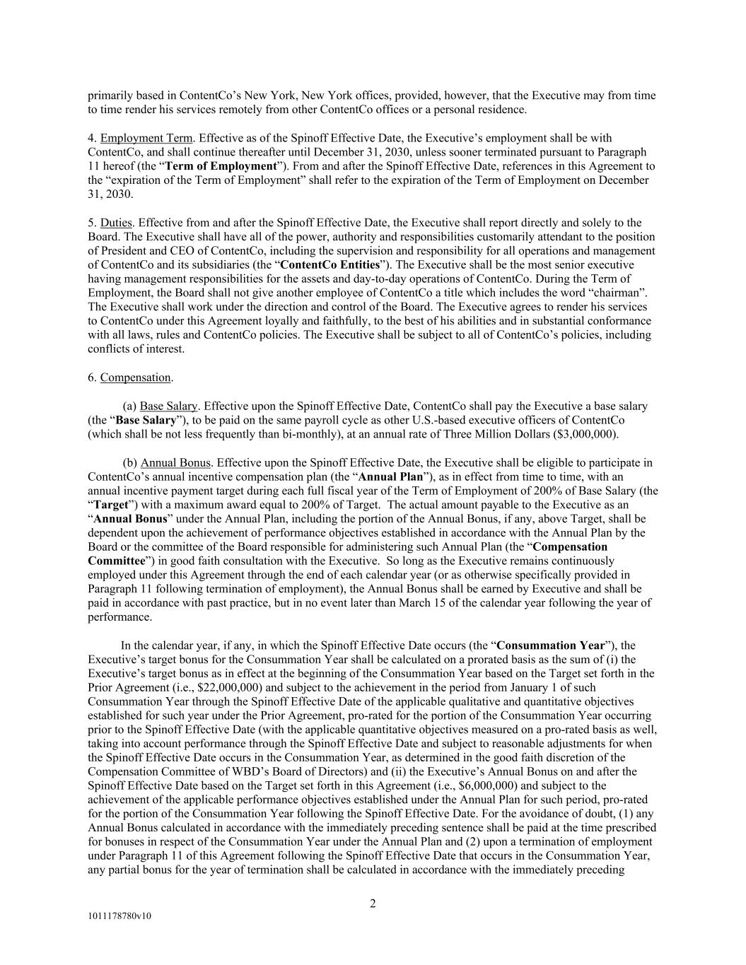 2 1011178780v10 primarily based in ContentCo’s New York, New York offices, provided, however, that the Executive may from time to time render his services remotely from other ContentCo offices or a personal residence. 4. Employment Term. Effective as of the Spinoff Effective Date, the Executive’s employment shall be with ContentCo, and shall continue thereafter until December 31, 2030, unless sooner terminated pursuant to Paragraph 11 hereof (the “Term of Employment”). From and after the Spinoff Effective Date, references in this Agreement to the “expiration of the Term of Employment” shall refer to the expiration of the Term of Employment on December 31, 2030. 5. Duties. Effective from and after the Spinoff Effective Date, the Executive shall report directly and solely to the Board. The Executive shall have all of the power, authority and responsibilities customarily attendant to the position of President and CEO of ContentCo, including the supervision and responsibility for all operations and management of ContentCo and its subsidiaries (the “ContentCo Entities”). The Executive shall be the most senior executive having management responsibilities for the assets and day-to-day operations of ContentCo. During the Term of Employment, the Board shall not give another employee of ContentCo a title which includes the word “chairman”. The Executive shall work under the direction and control of the Board. The Executive agrees to render his services to ContentCo under this Agreement loyally and faithfully, to the best of his abilities and in substantial conformance with all laws, rules and ContentCo policies. The Executive shall be subject to all of ContentCo’s policies, including conflicts of interest. 6. Compensation. (a) Base Salary. Effective upon the Spinoff Effective Date, ContentCo shall pay the Executive a base salary (the “Base Salary”), to be paid on the same payroll cycle as other U.S.-based executive officers of ContentCo (which shall be not less frequently than bi-monthly), at an annual rate of Three Million Dollars ($3,000,000). (b) Annual Bonus. Effective upon the Spinoff Effective Date, the Executive shall be eligible to participate in ContentCo’s annual incentive compensation plan (the “Annual Plan”), as in effect from time to time, with an annual incentive payment target during each full fiscal year of the Term of Employment of 200% of Base Salary (the “Target”) with a maximum award equal to 200% of Target. The actual amount payable to the Executive as an “Annual Bonus” under the Annual Plan, including the portion of the Annual Bonus, if any, above Target, shall be dependent upon the achievement of performance objectives established in accordance with the Annual Plan by the Board or the committee of the Board responsible for administering such Annual Plan (the “Compensation Committee”) in good faith consultation with the Executive. So long as the Executive remains continuously employed under this Agreement through the end of each calendar year (or as otherwise specifically provided in Paragraph 11 following termination of employment), the Annual Bonus shall be earned by Executive and shall be paid in accordance with past practice, but in no event later than March 15 of the calendar year following the year of performance. In the calendar year, if any, in which the Spinoff Effective Date occurs (the “Consummation Year”), the Executive’s target bonus for the Consummation Year shall be calculated on a prorated basis as the sum of (i) the Executive’s target bonus as in effect at the beginning of the Consummation Year based on the Target set forth in the Prior Agreement (i.e., $22,000,000) and subject to the achievement in the period from January 1 of such Consummation Year through the Spinoff Effective Date of the applicable qualitative and quantitative objectives established for such year under the Prior Agreement, pro-rated for the portion of the Consummation Year occurring prior to the Spinoff Effective Date (with the applicable quantitative objectives measured on a pro-rated basis as well, taking into account performance through the Spinoff Effective Date and subject to reasonable adjustments for when the Spinoff Effective Date occurs in the Consummation Year, as determined in the good faith discretion of the Compensation Committee of WBD’s Board of Directors) and (ii) the Executive’s Annual Bonus on and after the Spinoff Effective Date based on the Target set forth in this Agreement (i.e., $6,000,000) and subject to the achievement of the applicable performance objectives established under the Annual Plan for such period, pro-rated for the portion of the Consummation Year following the Spinoff Effective Date. For the avoidance of doubt, (1) any Annual Bonus calculated in accordance with the immediately preceding sentence shall be paid at the time prescribed for bonuses in respect of the Consummation Year under the Annual Plan and (2) upon a termination of employment under Paragraph 11 of this Agreement following the Spinoff Effective Date that occurs in the Consummation Year, any partial bonus for the year of termination shall be calculated in accordance with the immediately preceding